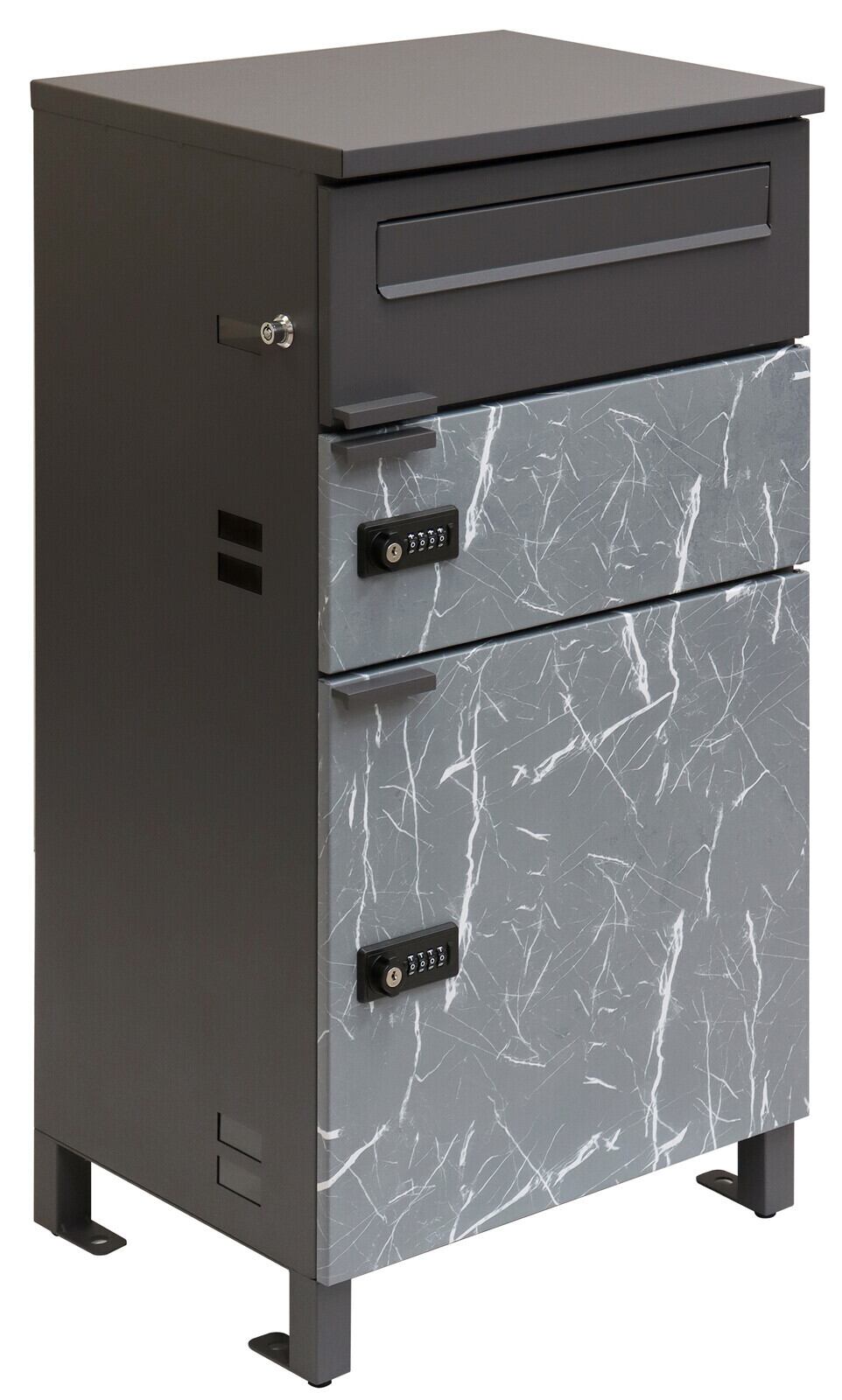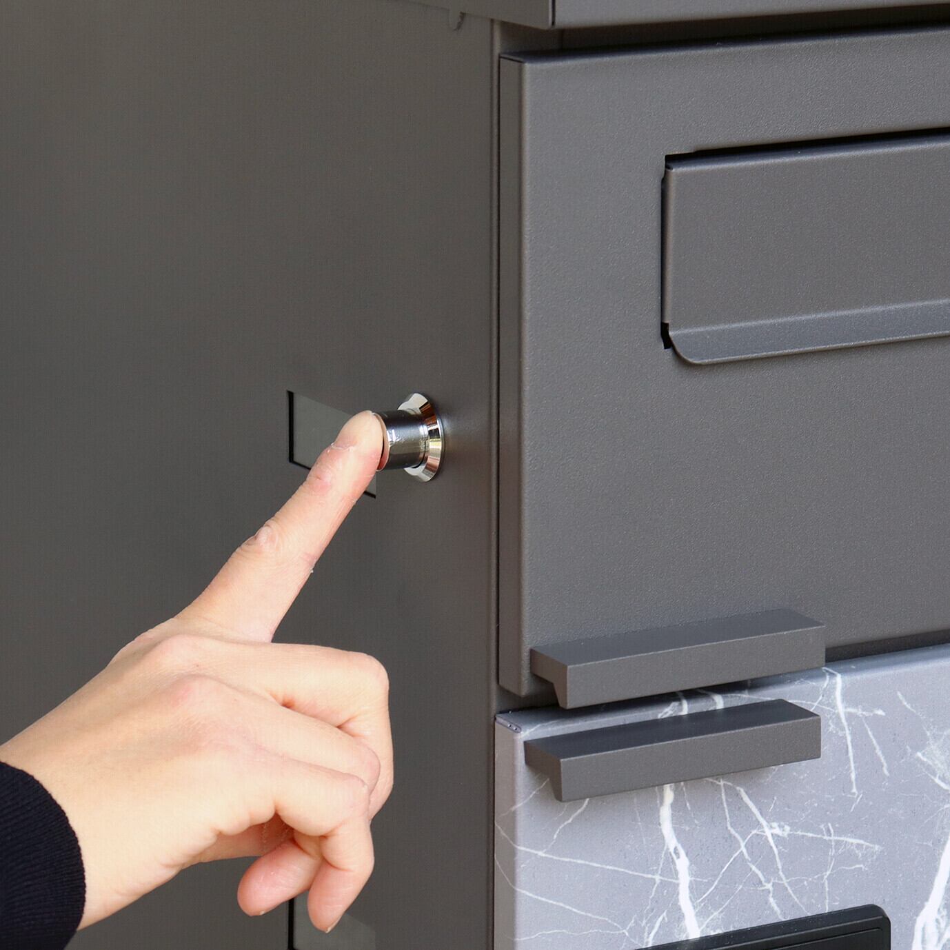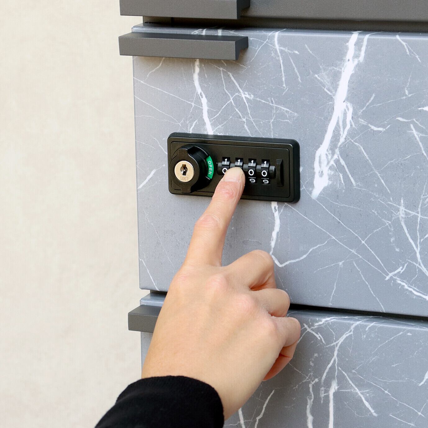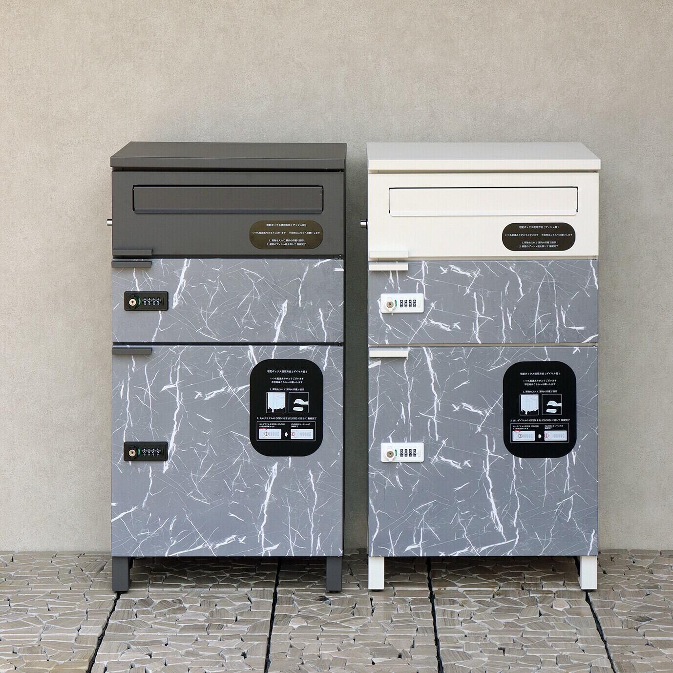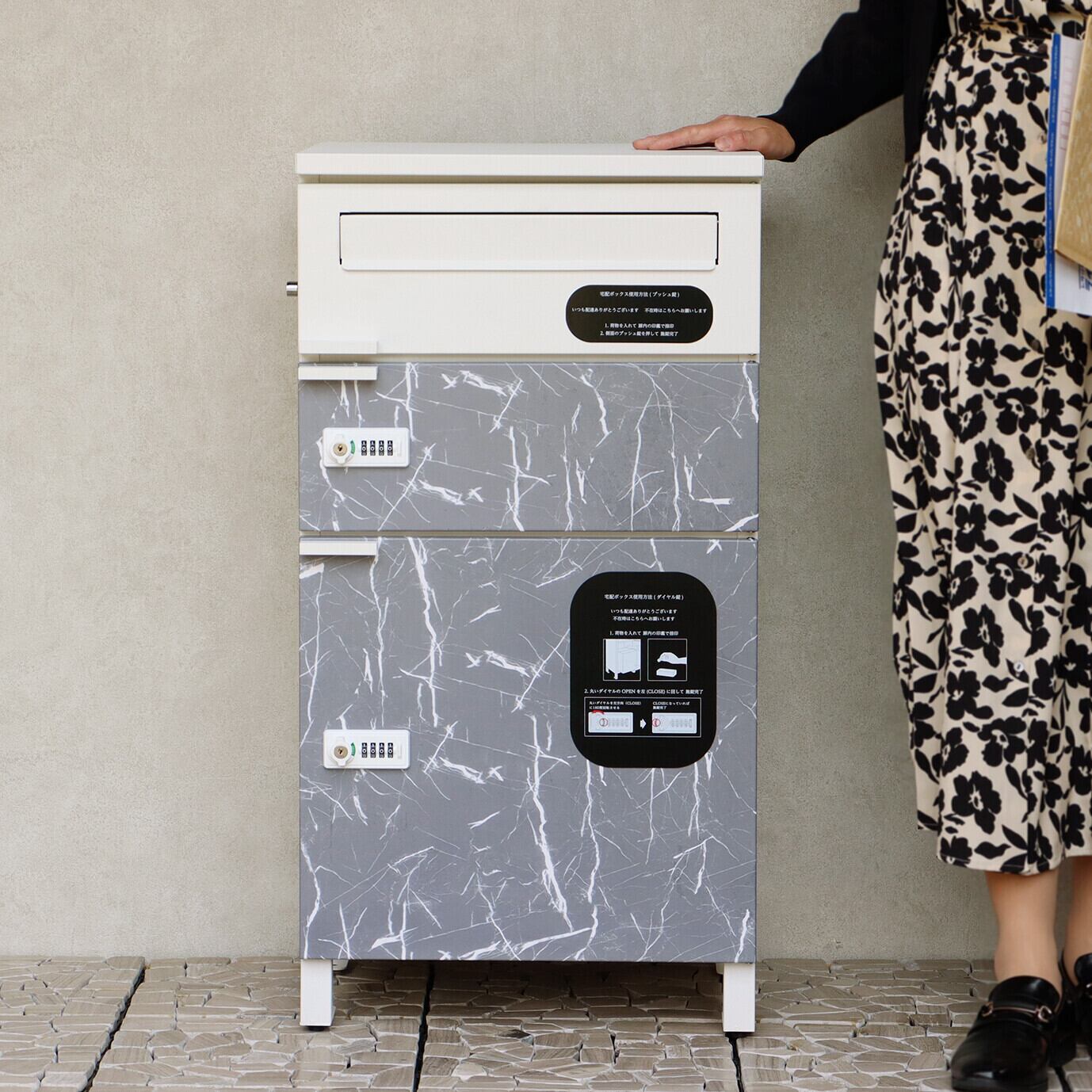最上段は、プッシュキーで簡単に鍵の開閉が可能で、防犯面にも安心です。また、スペアキーが1本付属しております。宅配上段・下段ともに、ダイヤルロックとシリンダー錠(ダイヤル解錠番号が分からなくなった際の緊急用)の組み合わせタイプの鍵を使用しております。宅配上段・下段のダイアルロックは、鍵を施錠した際、鍵を解錠した際にダイアル番号が"0000"にリセットされ、ダイヤル番号の漏洩の心配がありません。最上段の郵便投函口は、ゆうパケットポストや、ネコポスが投函可能です。キー(3段すべて)、アンカーボルト、キーフック付印鑑ケース、宅配業者用の配達マニュアル(マグネット式でお好きな場所に貼付け可)が付属しており、お客様で追加でご用意頂くものは特に必要なく、すぐにご使用頂けます。カラーは、落ち着いたダークグレーとお家の外壁に合わせやすいホワイトの2色からお選び頂けます。宅配上段、宅配下段扉にはグレーの大理石風シートを使用しており、特徴のある仕上がりとなっております。ガルバナイズド処理を施しているため、錆びの発生がしにくい仕様となっております。投函口サイズが、約W36.0×H3.3cmと大きなサイズ設計で、大きな郵便物も投函可能です。宅配上段の宅配可能最大サイズは、約W39.9×D32.8×H11.8cm。宅配下段の宅配可能最大サイズは、約W39.9×D30.7×H36.5cmになります。印鑑ケースは3個付属しており、最上段も宅配ボックスとしての使用も可能です。