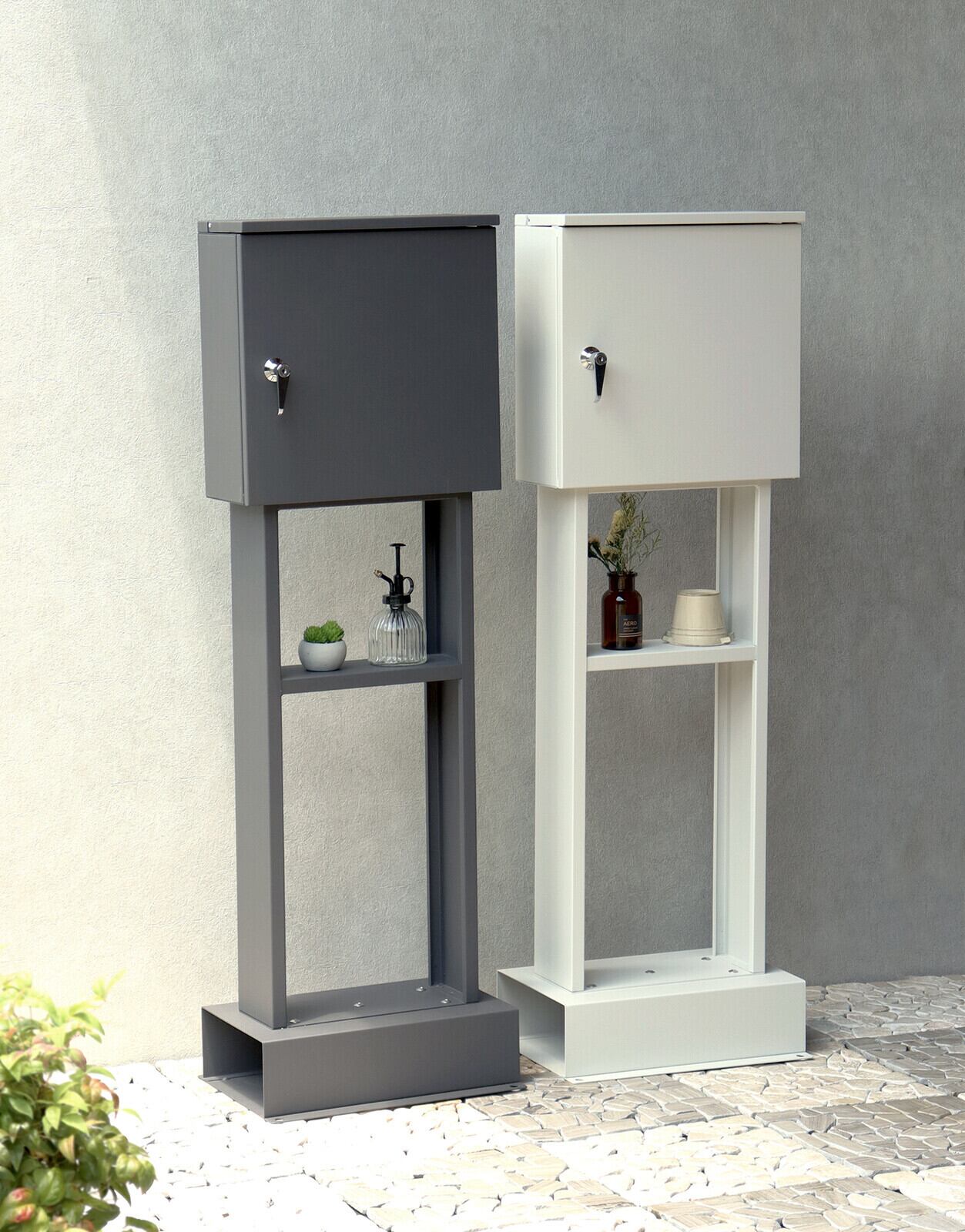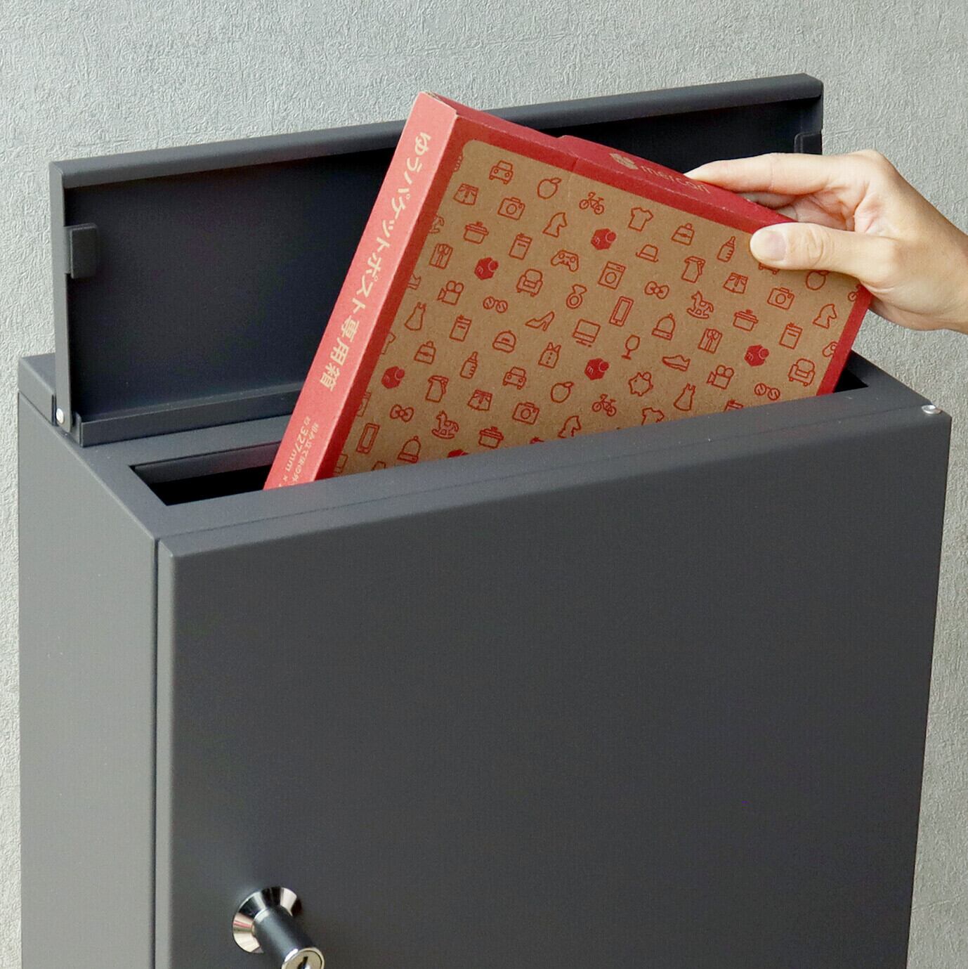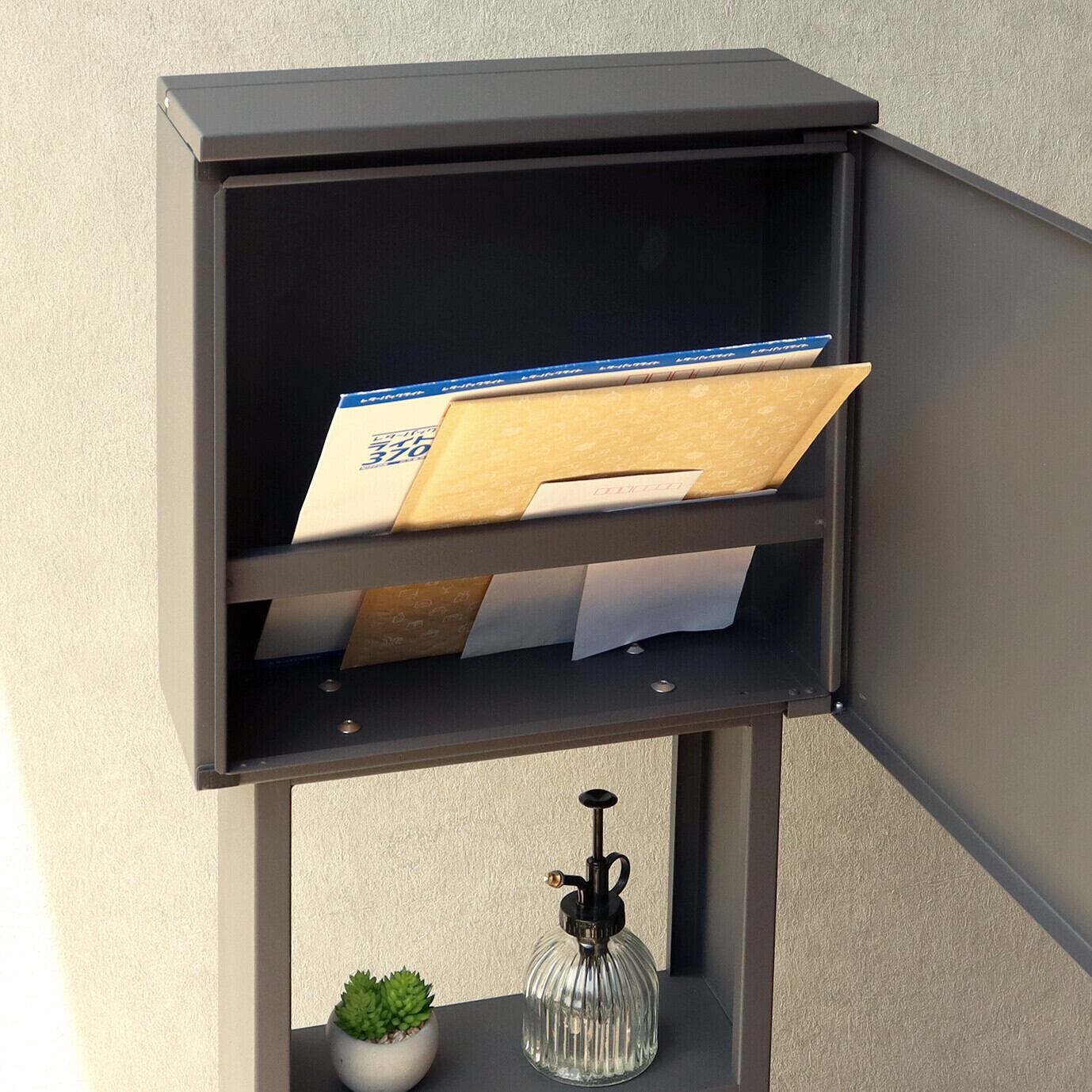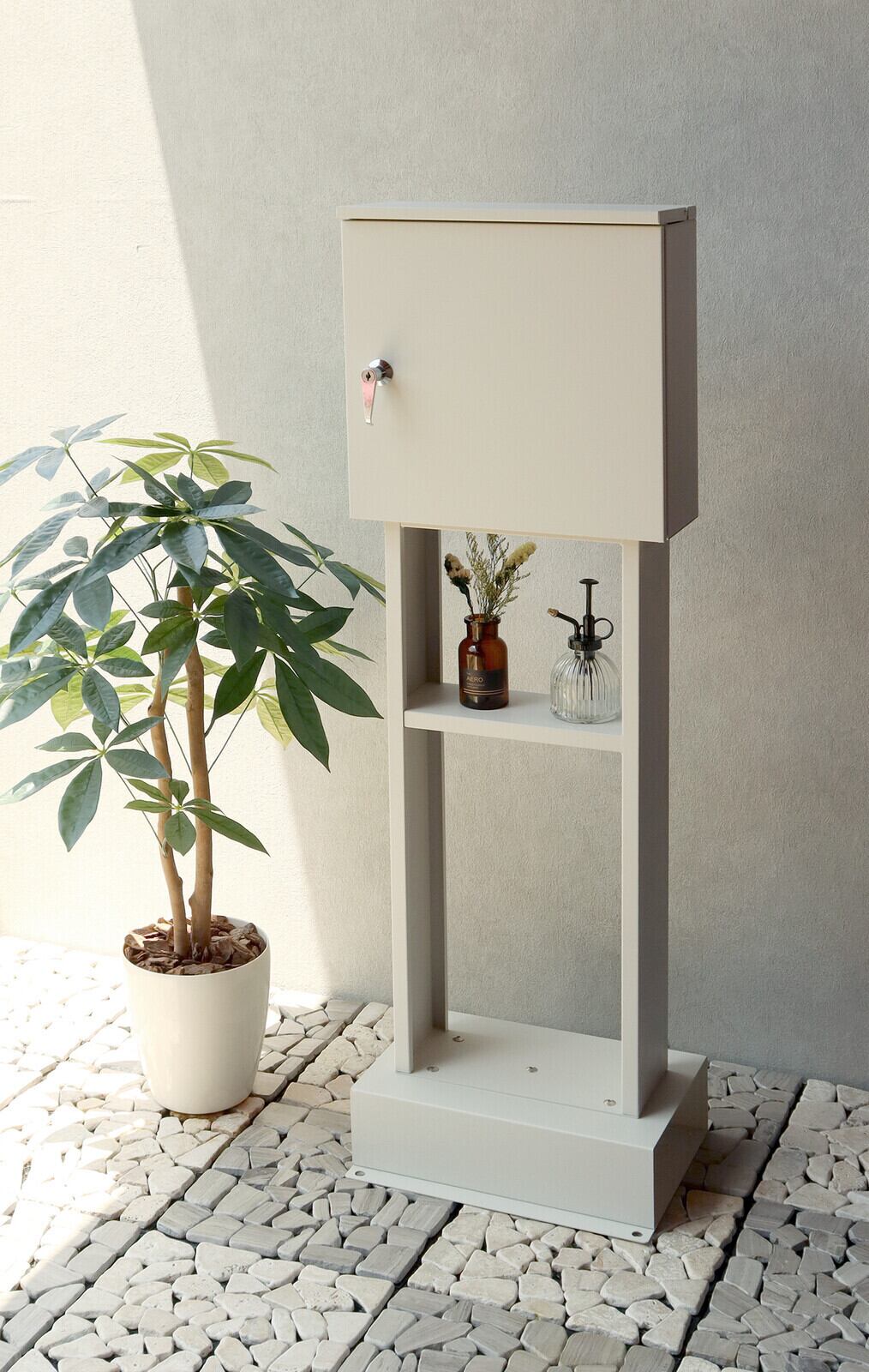 置くだけで使用可能なスタンド式で、壁掛け式とは異なり面倒な施工の手間がかかりません。ゆうパケットポストや、ネコポスが投函可能です。鍵付きなので防犯面に安心です。また、スペアキーが1本付属しています。棚板が1枚ついており(固定棚)、お花や玄関周りの小物置きとして便利です。鍵部はハンドルレバータイプを使用しており、ハンドルの操作で、鍵の開閉を行わずとも扉を閉めておくことが可能です。「郵便受け本体」、「支柱」、「台座」の3パーツのみをボルトで固定する簡易組立の商品となります。郵便取り出し口内部にストッパーが付いているため、取り出し時に郵便物が前に落ちにくい設計となっております。土台部は、標準サイズのレンガ(21×10×6cm)を最大3個入れることが可能です(横向き×2、縦向き×1)。キー、アンカーボルトが付属しており、お客様で追加でご用意頂くものはなく、すぐにご使用いただけます。郵便受け本体は、落ち着いた色合いのダークグレーと、くすんだベージュのグレージュの2色からお選び頂けます。ガルバナイズド処理を施しているため、錆びにくくなっております。地面固定用のアンカーボルトが付属します。土台部にアンカーボルトを打ち込む穴があり、地面とポストを固定することも可能です。