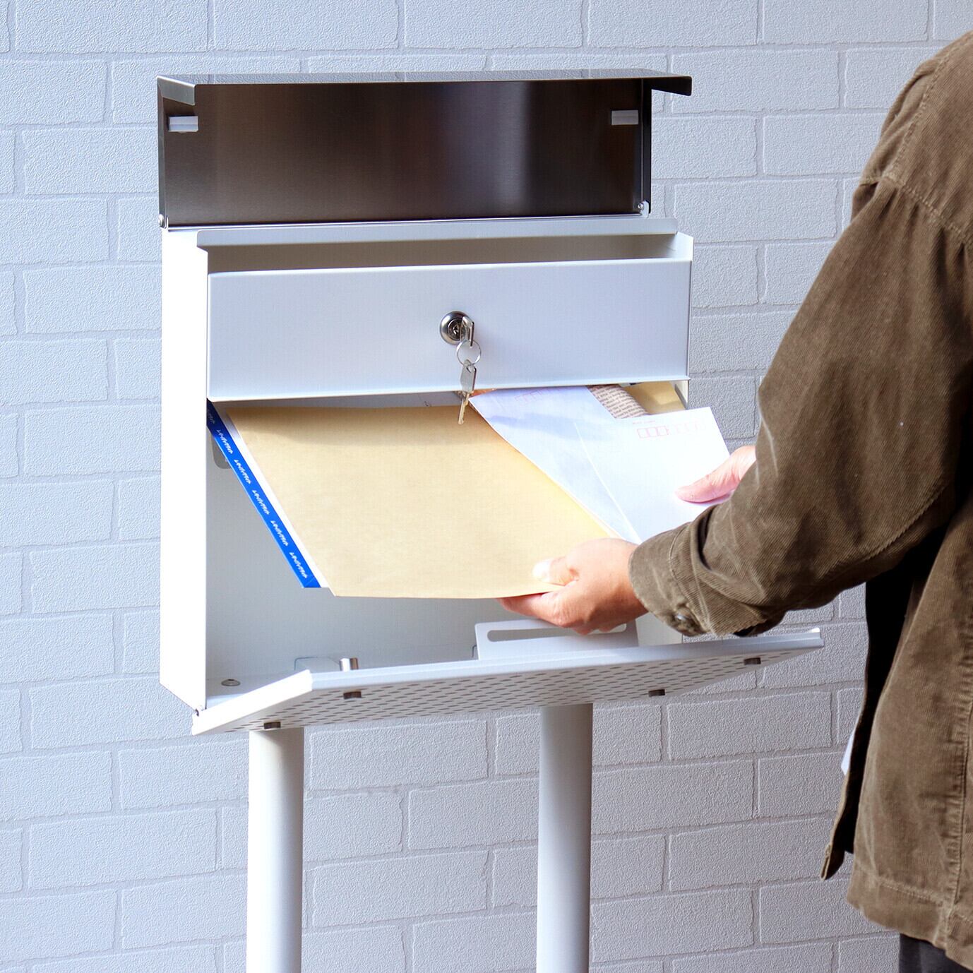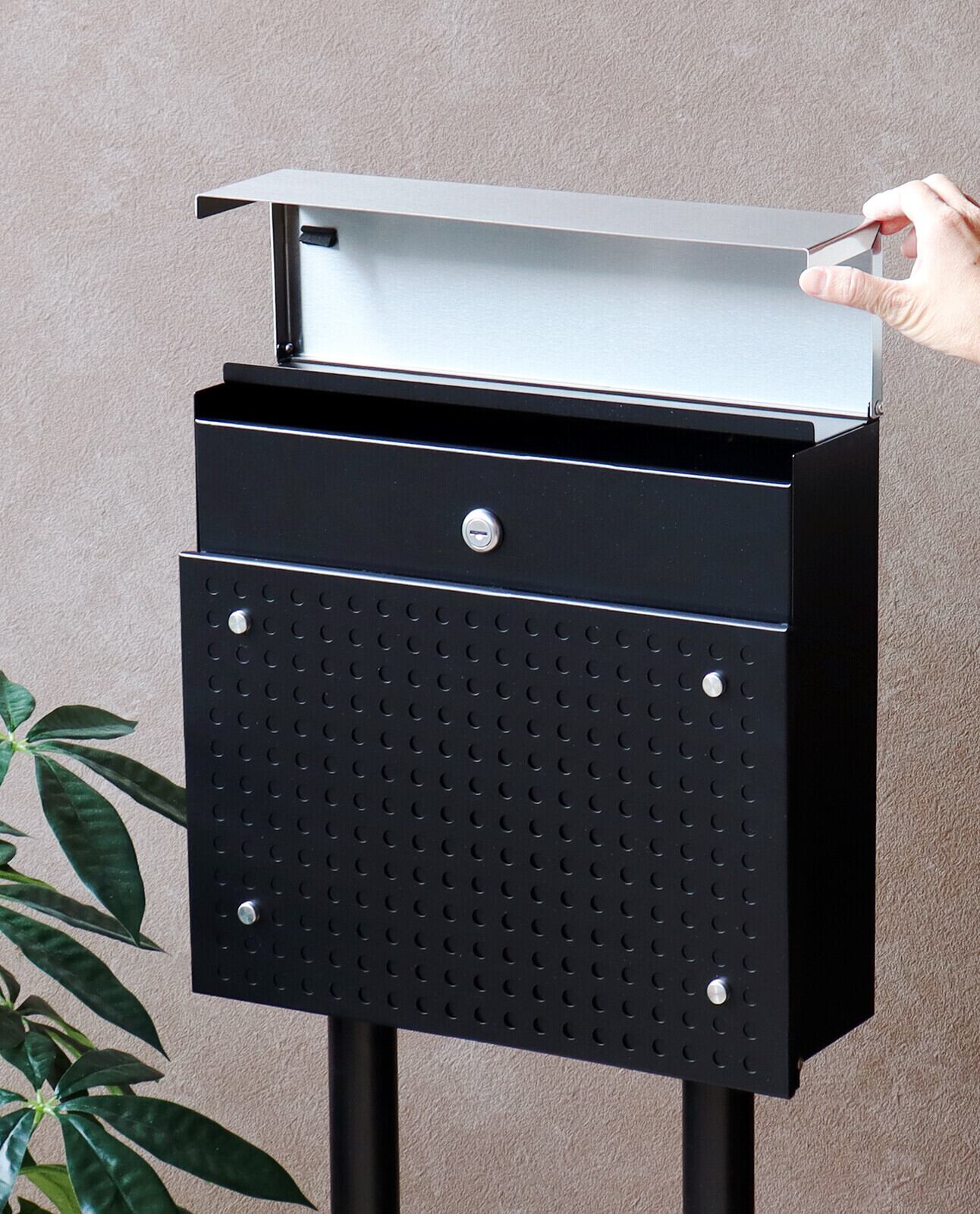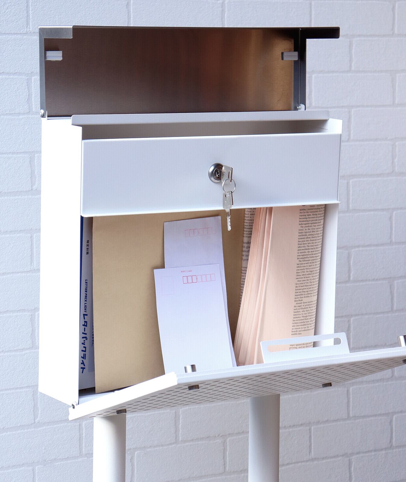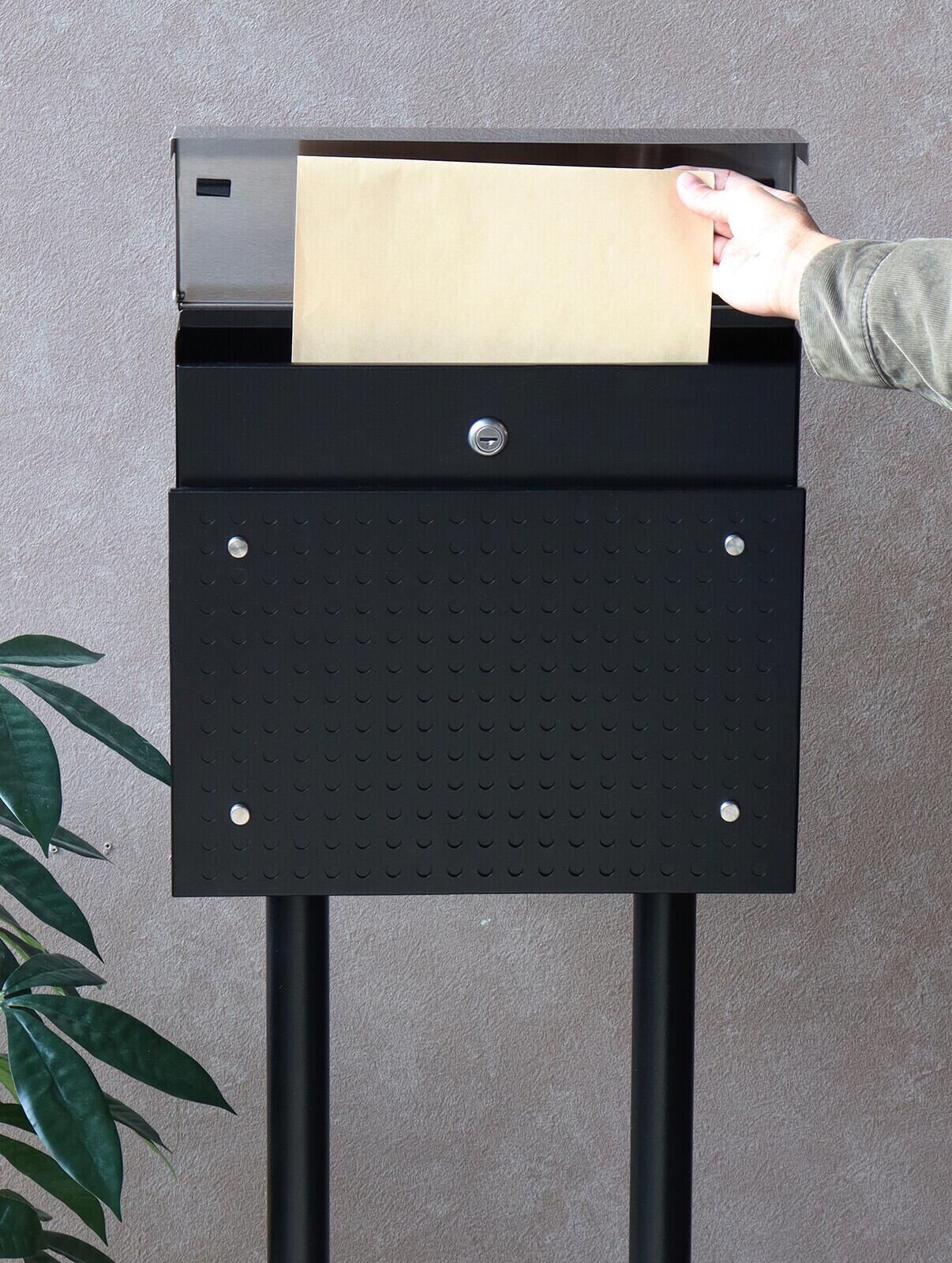 置くだけで使用可能なスタンド式で、壁掛け式とは異なり面倒な施工の手間がかかりません。茶封筒角型2号やレターパックライトが投函可能です。鍵付きなので防犯面に安心です。また、スペアキーが1本付属しています。郵便取出口は、扉が最大約75°くらいまでにしか開かない構造ですので、郵便物取り出し時に、郵便物の落下の心配がありません。土台部は、標準サイズのレンガを最大3個入れることが可能です。カラーは本体部ブラック、ホワイトのシンプルカラーと、上蓋のステンレスシルバーを組み合わせた色目の2色展開になります。前扉は、小さな丸い型で彩られており、デザインのアクセントになっております。ガルバナイズド処理を施しているため、錆びにくくなっております。地面固定用のアンカーボルトが付属します。土台部にアンカーボルトを打ち込む穴があり、地面とポストを固定することも可能です。