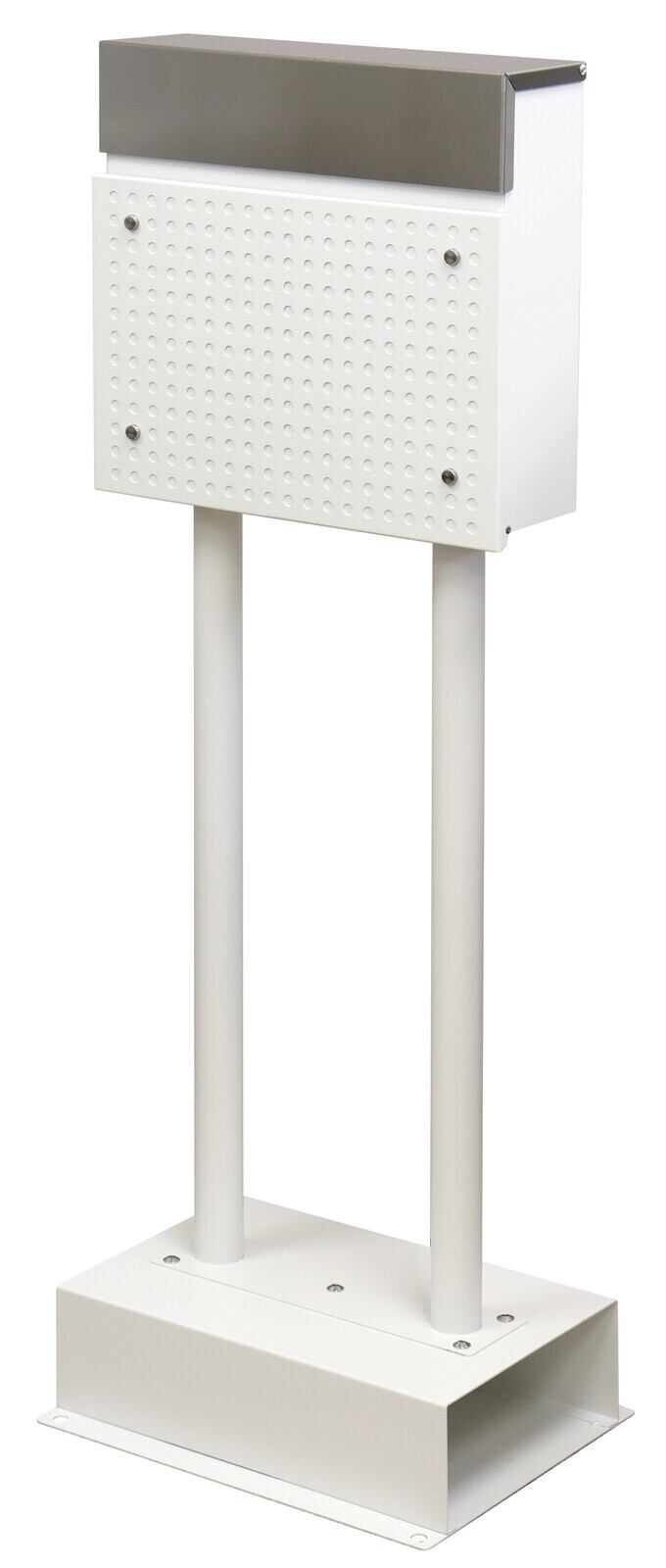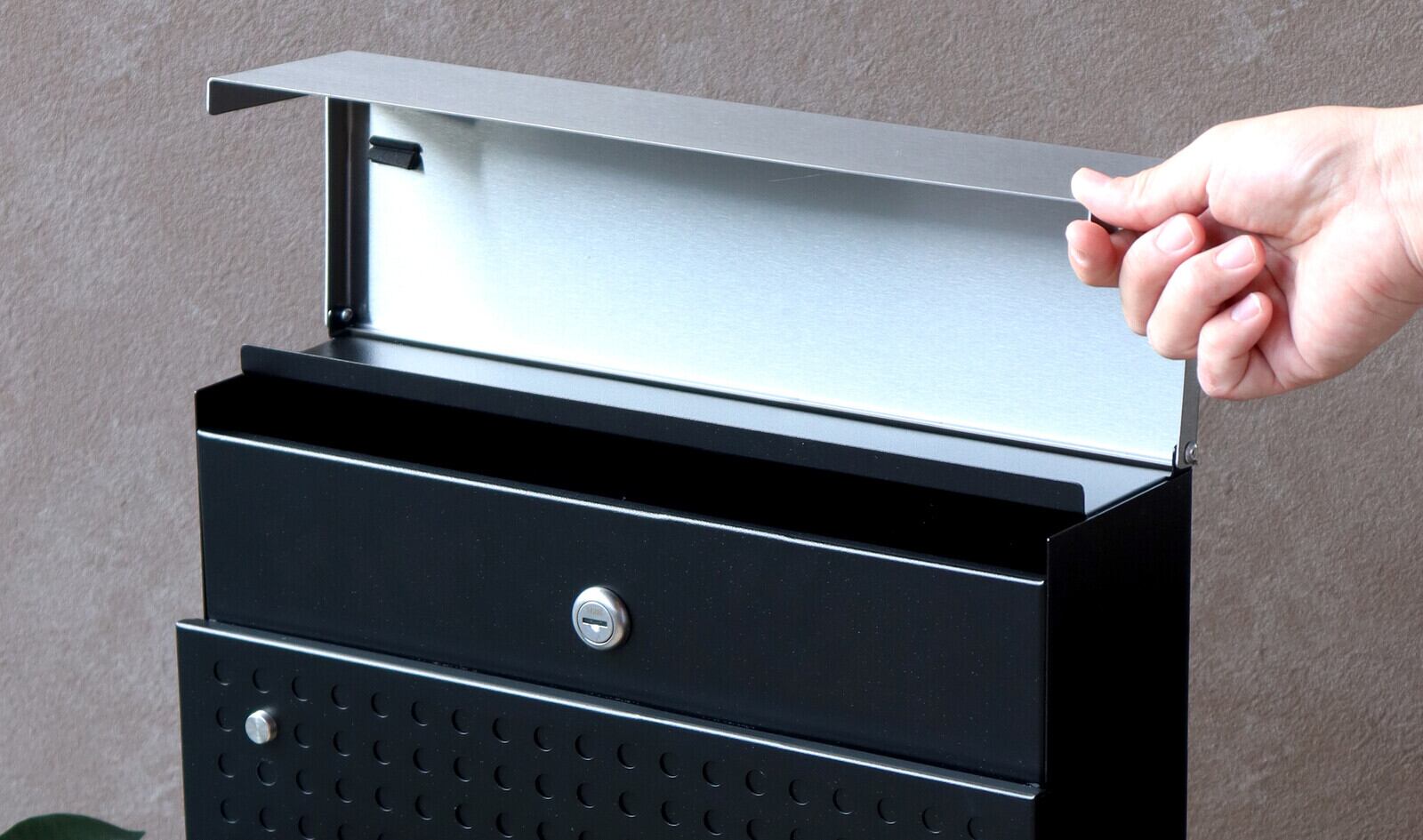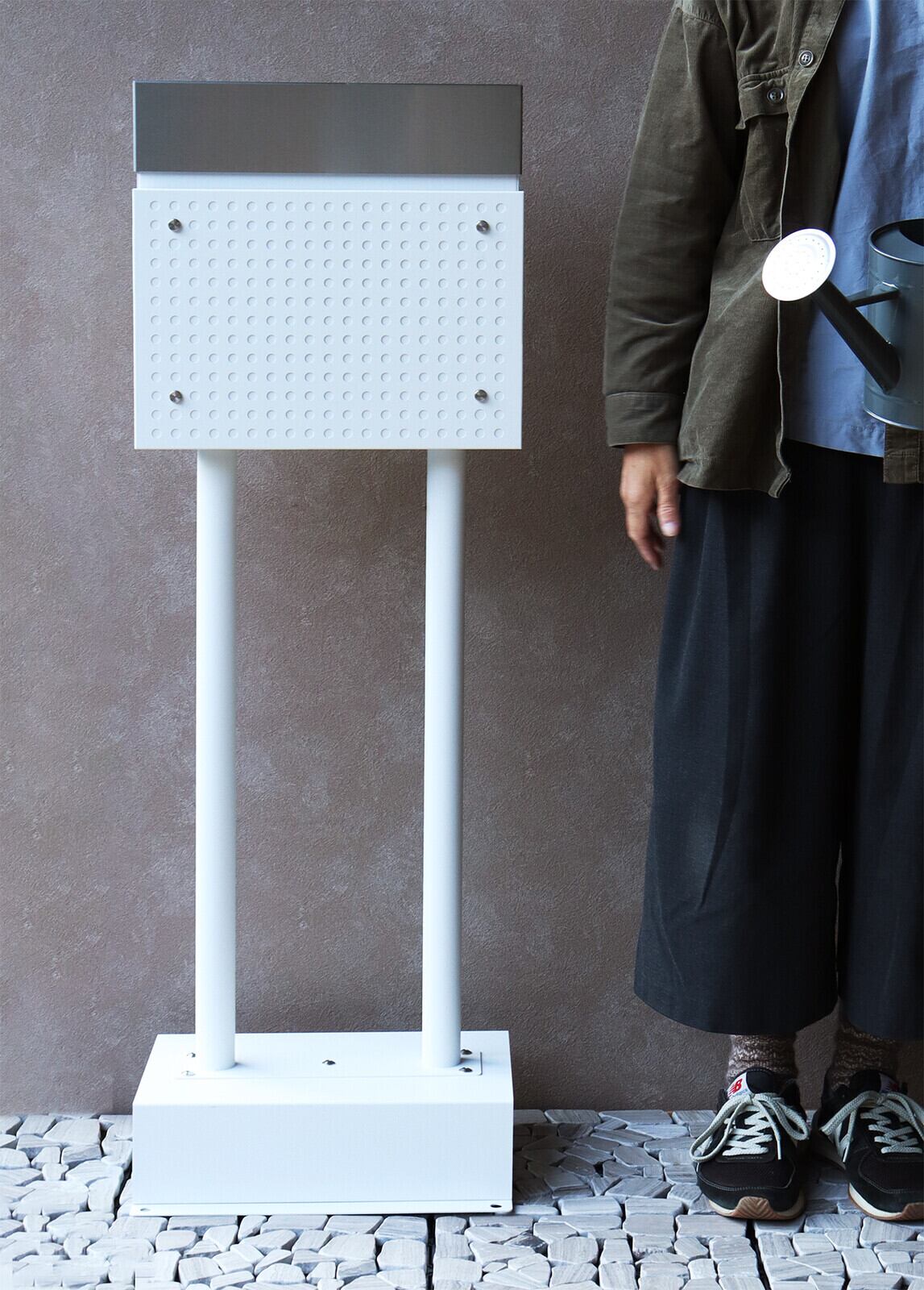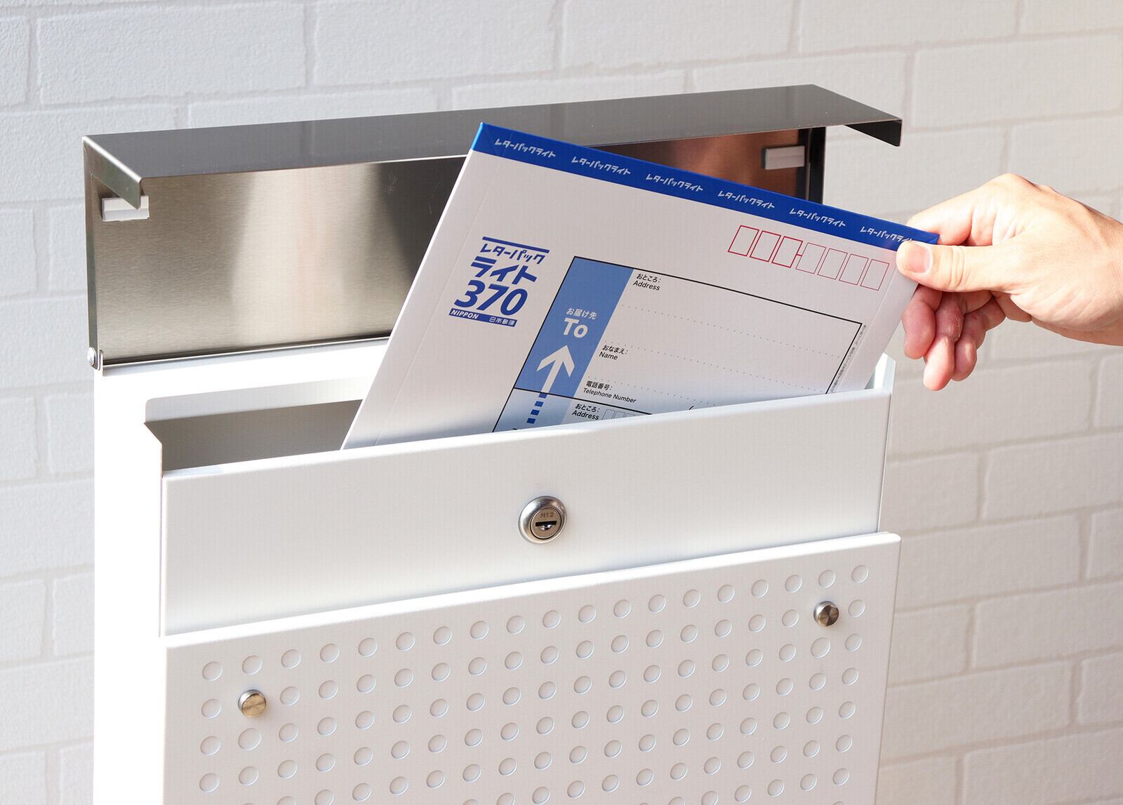 置くだけで使用可能なスタンド式で、壁掛け式とは異なり面倒な施工の手間がかかりません。茶封筒角型2号やレターパックライトが投函可能です。鍵付きなので防犯面に安心です。また、スペアキーが1本付属しています。郵便取出口は、扉が最大約75°くらいまでにしか開かない構造ですので、郵便物取り出し時に、郵便物の落下の心配がありません。土台部は、標準サイズのレンガを最大3個入れることが可能です。カラーは本体部ブラック、ホワイトのシンプルカラーと、上蓋のステンレスシルバーを組み合わせた色目の2色展開になります。前扉は、小さな丸い型で彩られており、デザインのアクセントになっております。ガルバナイズド処理を施しているため、錆びにくくなっております。地面固定用のアンカーボルトが付属します。土台部にアンカーボルトを打ち込む穴があり、地面とポストを固定することも可能です。