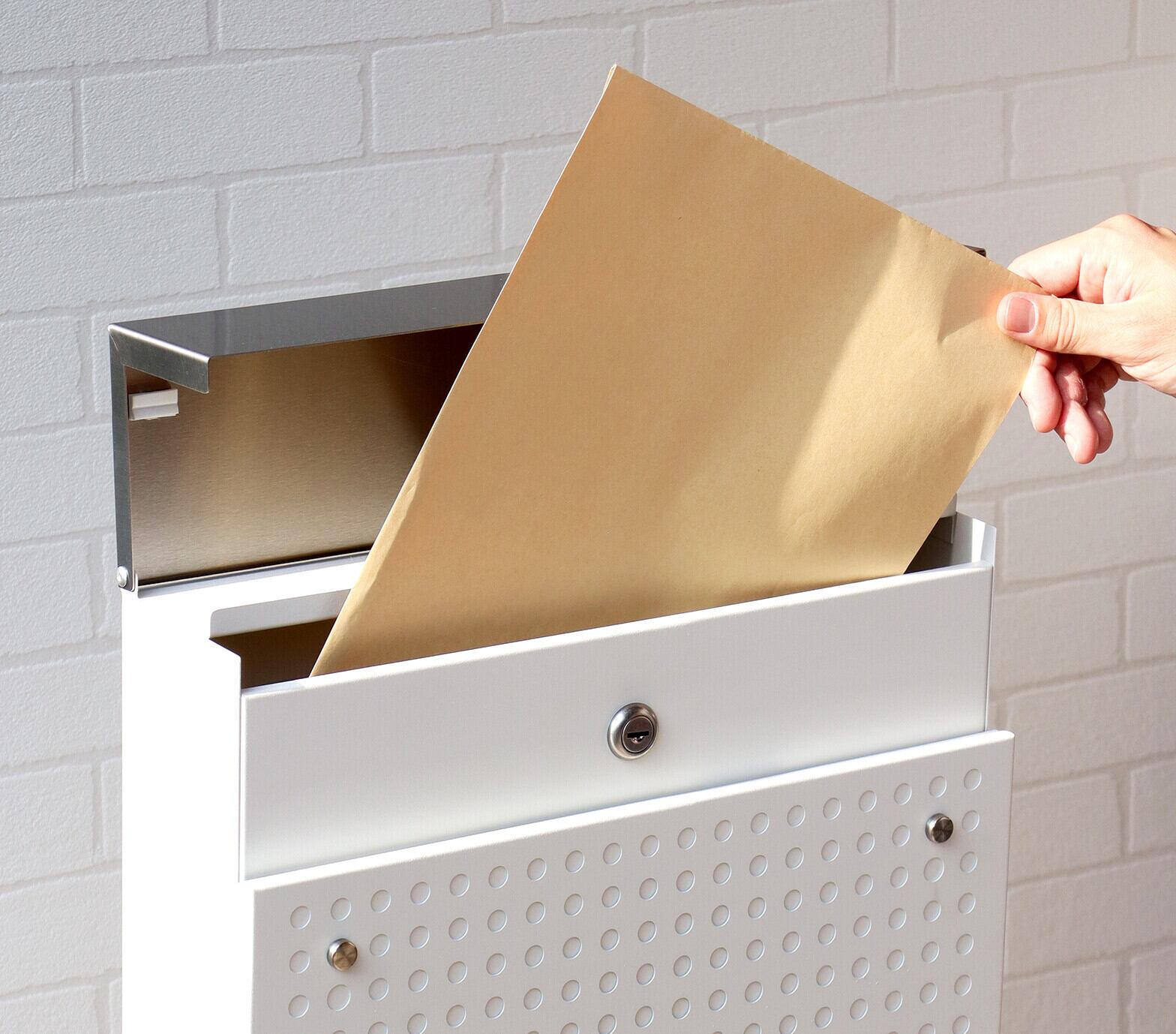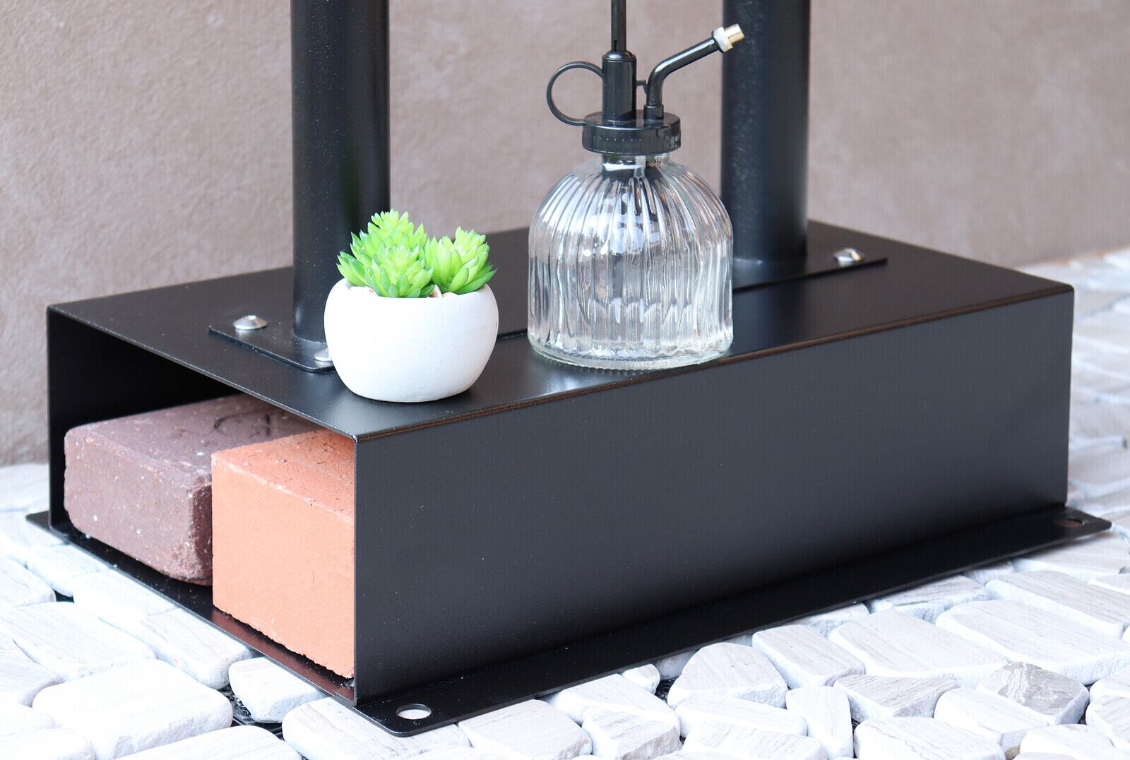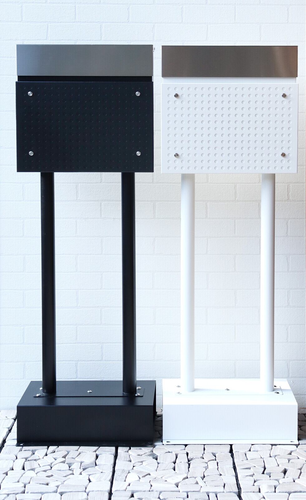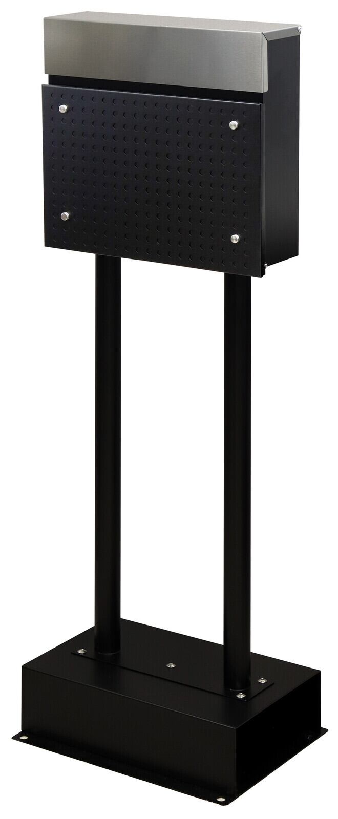 置くだけで使用可能なスタンド式で、壁掛け式とは異なり面倒な施工の手間がかかりません。茶封筒角型2号やレターパックライトが投函可能です。鍵付きなので防犯面に安心です。また、スペアキーが1本付属しています。郵便取出口は、扉が最大約75°くらいまでにしか開かない構造ですので、郵便物取り出し時に、郵便物の落下の心配がありません。土台部は、標準サイズのレンガを最大3個入れることが可能です。カラーは本体部ブラック、ホワイトのシンプルカラーと、上蓋のステンレスシルバーを組み合わせた色目の2色展開になります。前扉は、小さな丸い型で彩られており、デザインのアクセントになっております。ガルバナイズド処理を施しているため、錆びにくくなっております。地面固定用のアンカーボルトが付属します。土台部にアンカーボルトを打ち込む穴があり、地面とポストを固定することも可能です。