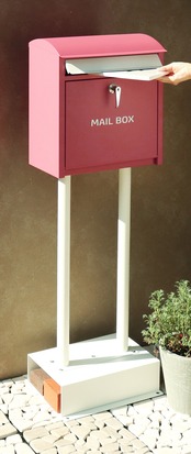 置くだけで使用可能なスタンド式で、壁掛け式とは異なり面倒な施工の手間がかかりません。茶封筒角型2号やレターパックライトが投函可能です。鍵付きなので防犯面に安心です。また、スペアキーが1本付属しています。郵便取出口は、扉が最大約75°くらいまでにしか開かない構造ですので、郵便物取り出し時に、郵便物の落下の心配がありません。土台部は、標準サイズのレンガを最大3個入れることが可能です。カラーは上品な色合いのワインレッドとくすんだブルーのラベンダーブルーで、脚と台座部、郵便投函口はホワイトになります。ポスト本体が特徴を持ったカラーで、玄関を綺麗に彩ります。ガルバナイズド処理を施しているため、錆びにくくなっております。地面固定用のアンカーボルトが付属します。土台部にアンカーボルトを打ち込む穴があり、地面とポストを固定することも可能です。