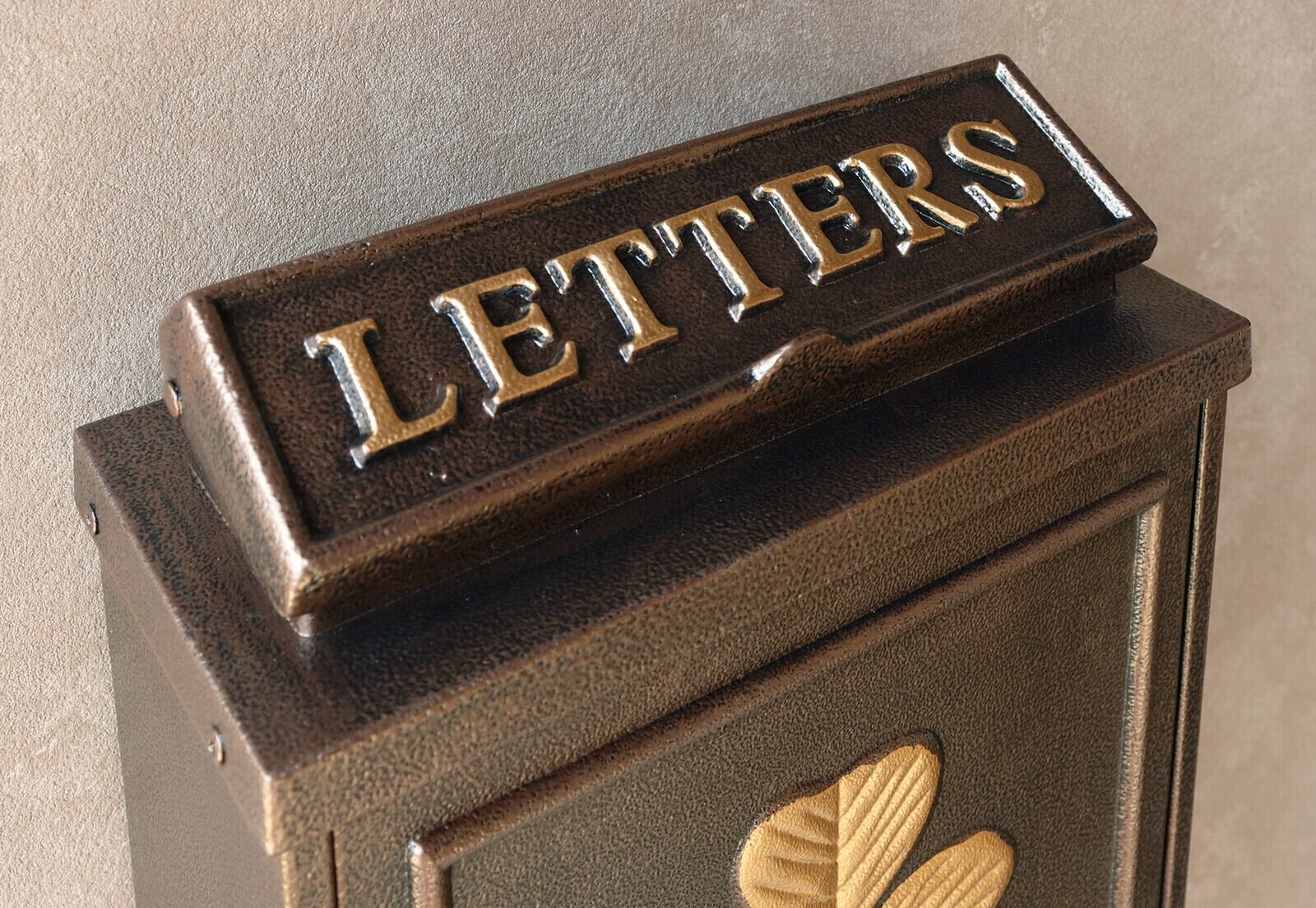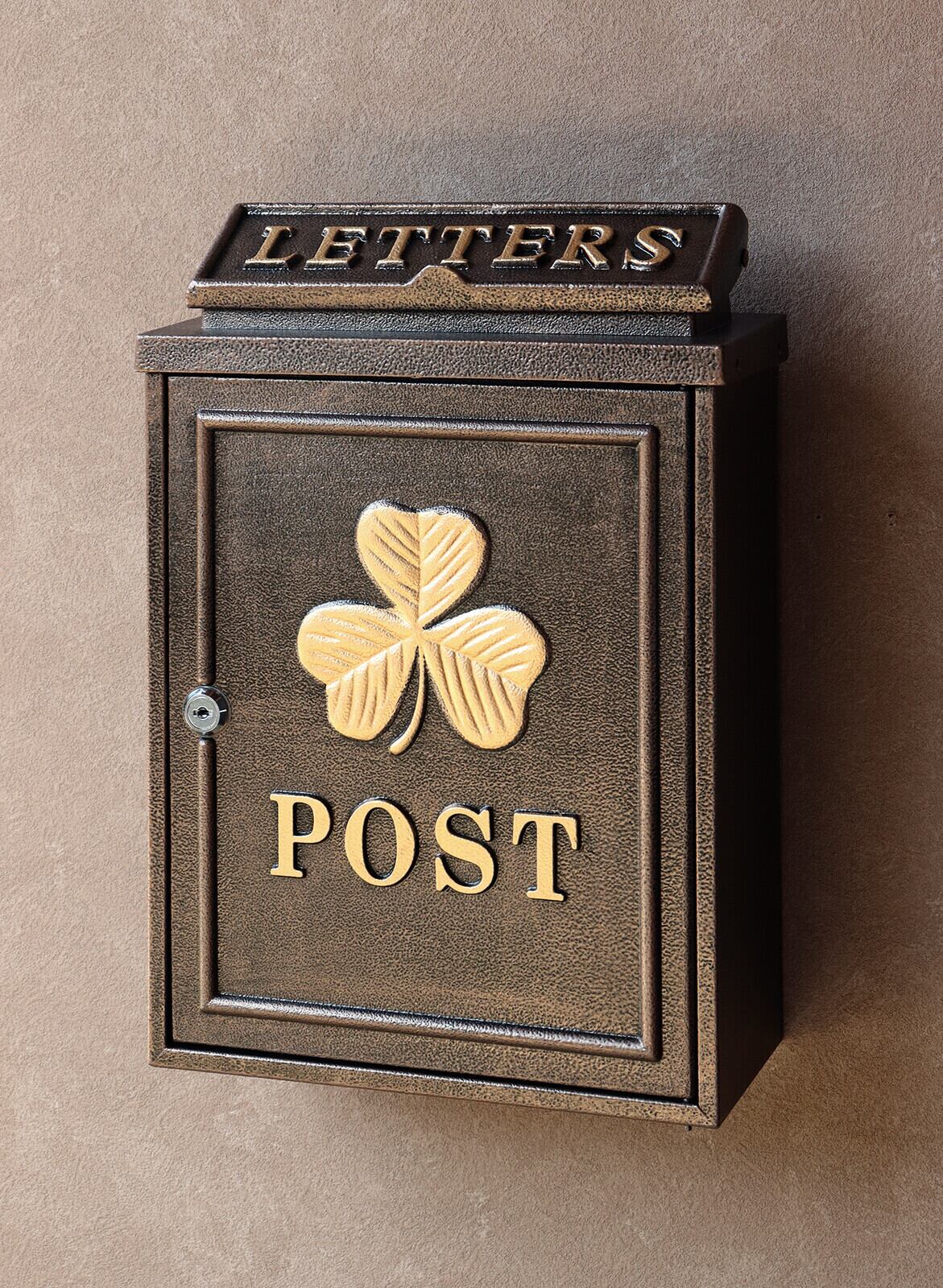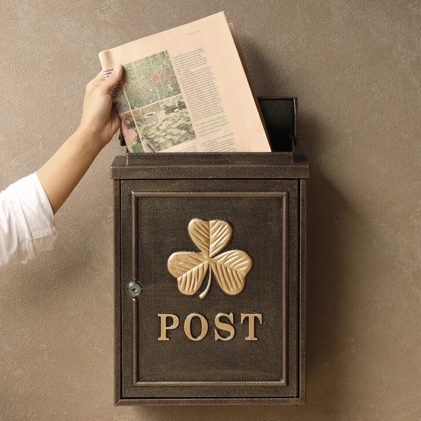 茶封筒角型2号が投函可能です。鍵付きなので防犯面に安心です。また、スペアキーが1本付属しています。珍しい鋳造加工のポストで、お家の外観にインパクトを与えます。クローバーの型を使用し、ポストのデザインにアクセントを加えております。カラーはブロンズとグリーンよりお選びいただけます。和風、洋風のお家、どちらにもマッチするアンティークカラーです。郵便取り出し口に、郵便物転落防止のストッパー付きで、郵便物を安心して取り出し頂けます。壁面に取付用のアンカー、取付ネジ、ワッシャー、スペーサーが付属しております。