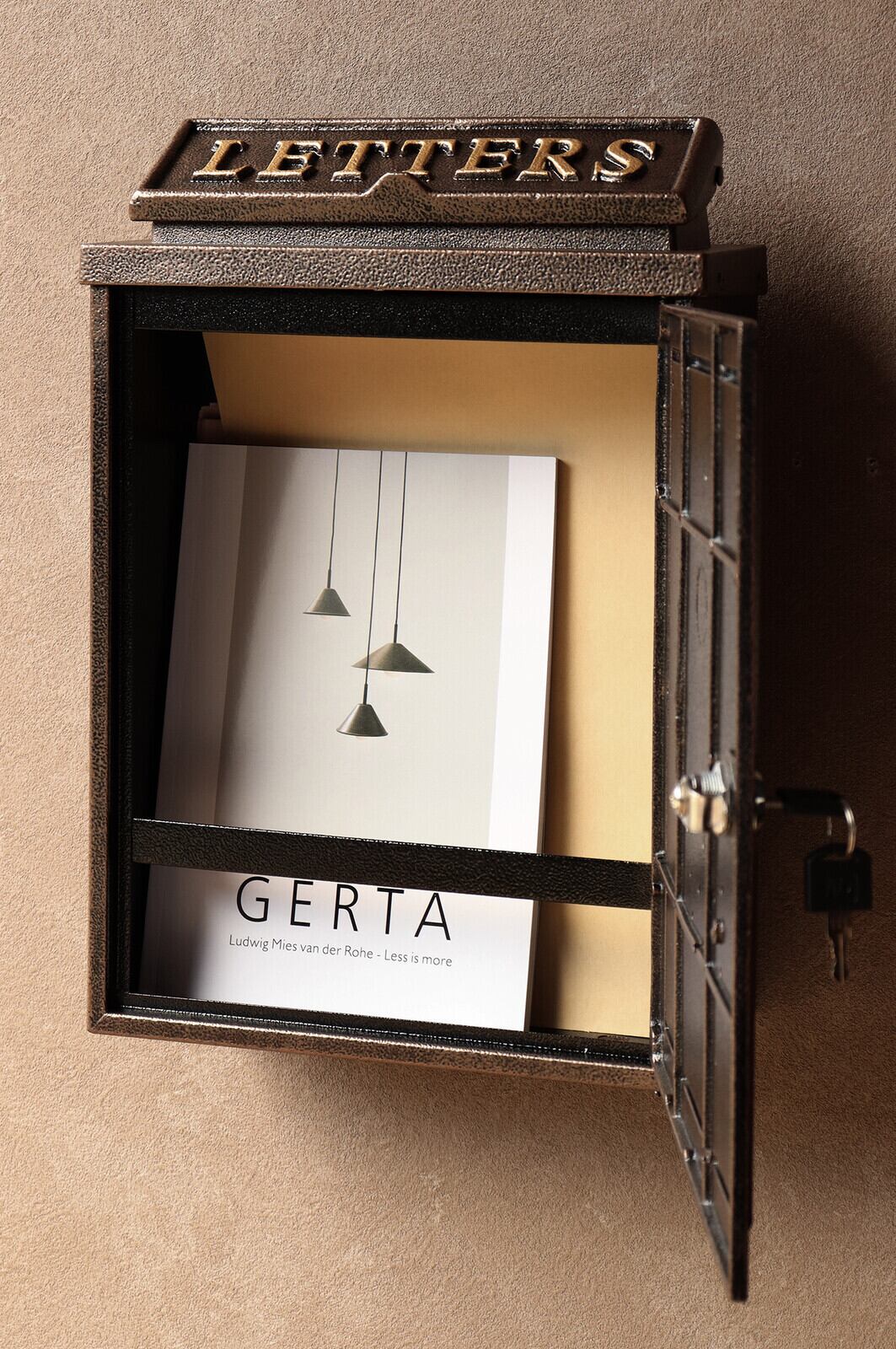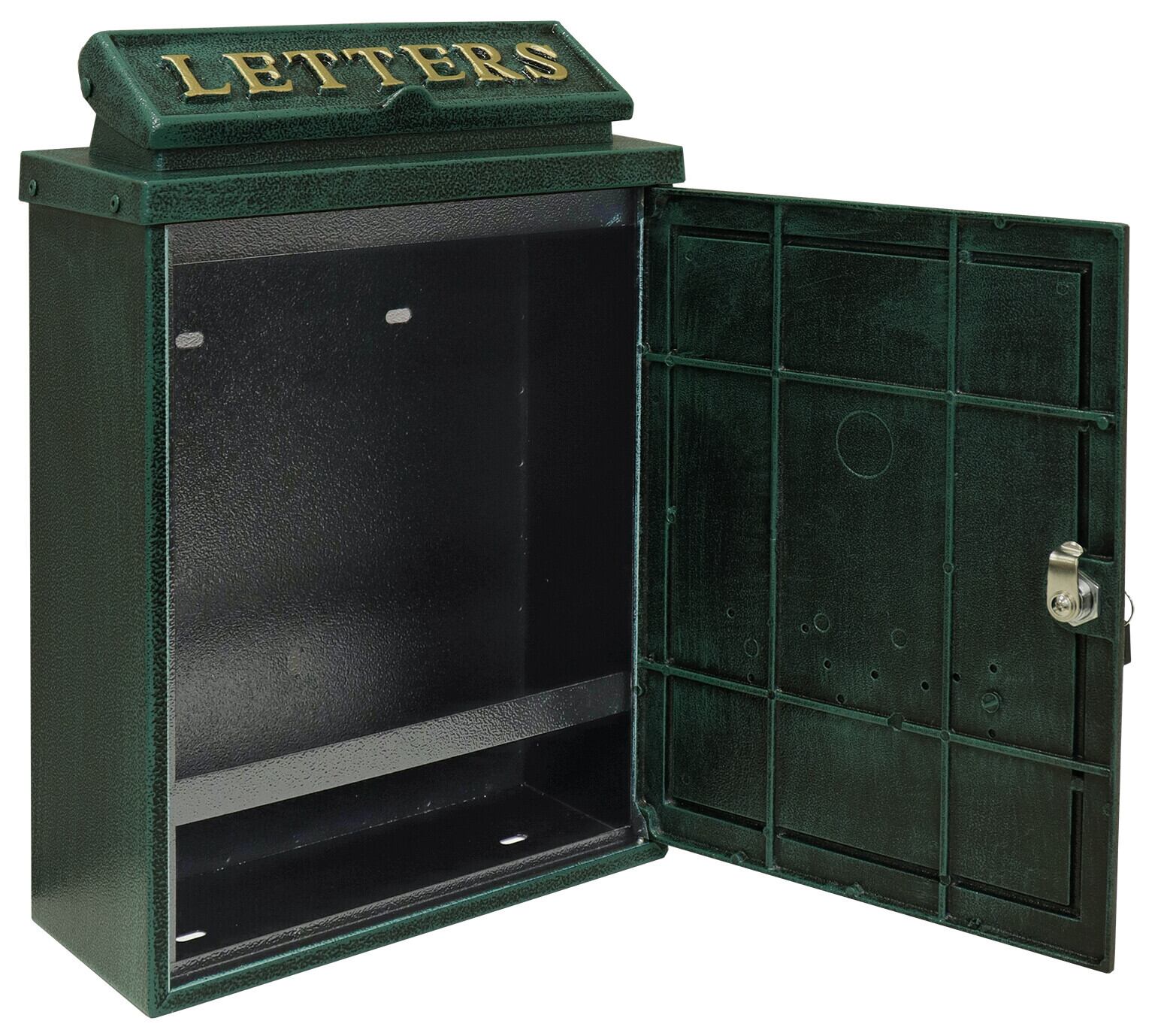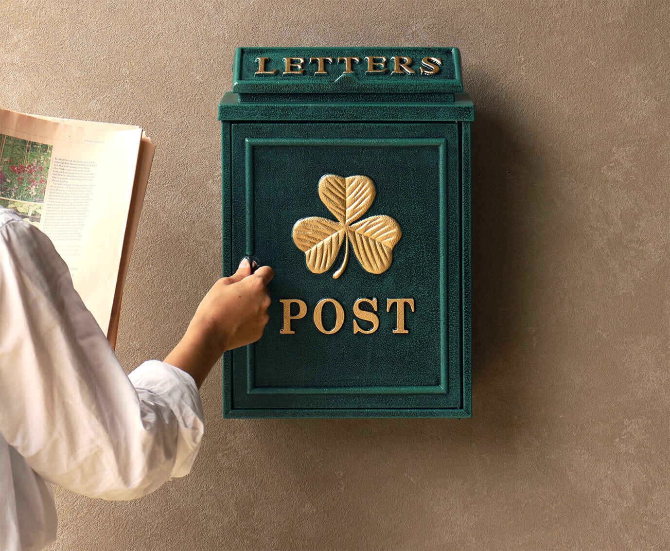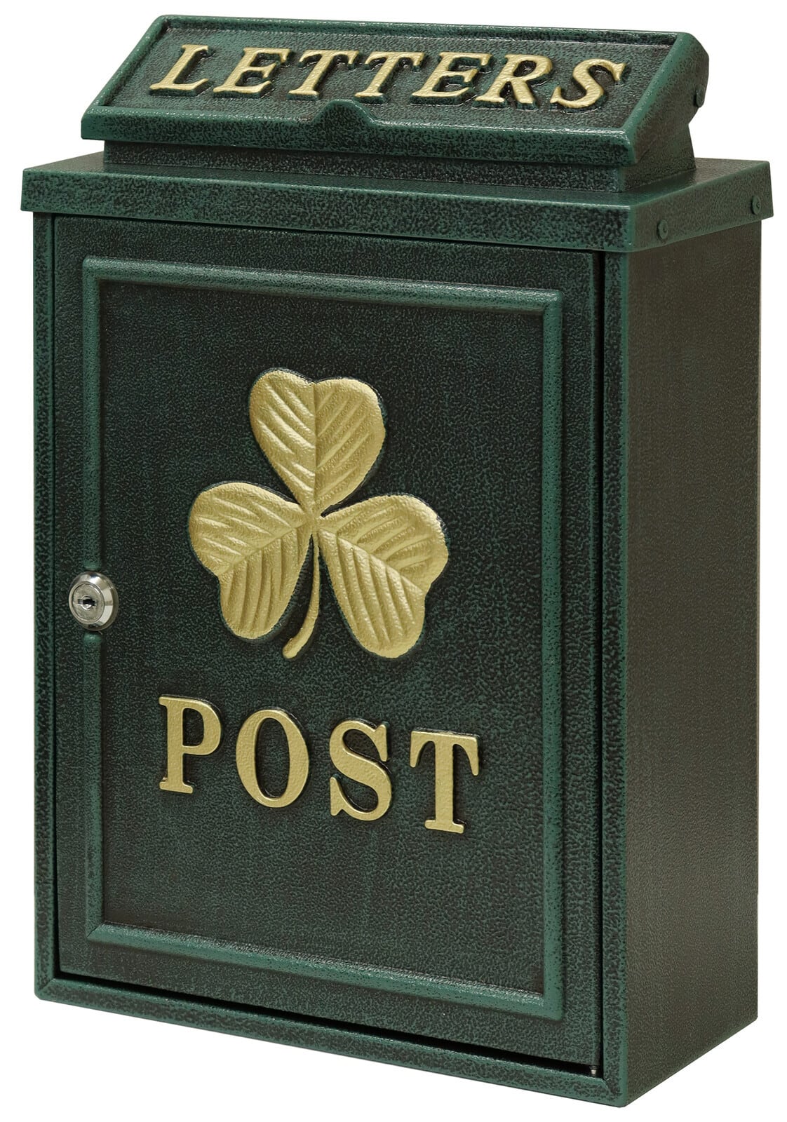 茶封筒角型2号が投函可能です。鍵付きなので防犯面に安心です。また、スペアキーが1本付属しています。珍しい鋳造加工のポストで、お家の外観にインパクトを与えます。クローバーの型を使用し、ポストのデザインにアクセントを加えております。カラーはブロンズとグリーンよりお選びいただけます。和風、洋風のお家、どちらにもマッチするアンティークカラーです。郵便取り出し口に、郵便物転落防止のストッパー付きで、郵便物を安心して取り出し頂けます。壁面に取付用のアンカー、取付ネジ、ワッシャー、スペーサーが付属しております。