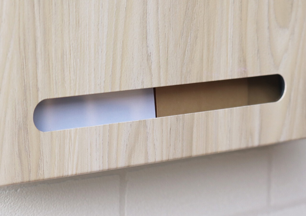 茶封筒角型2号やレターパックライトが投函可能です。鍵付きなので防犯面に安心です。また、スペアキーが1本付属しています。前扉の下部にスリット窓が付いているため、鍵をあけなくても郵便物が投函されているのか確認が可能です。取り出し口に手が付いているため、開閉がし易くなっております。カラーは、くすんだベージュのグレージュと爽やかなスカイブルーからお選びいただけます。また、取り出し口の扉には相性の良いホワイト系の木目を採用しています。ガルバナイズド処理を施しているため、錆びにくくなっております。壁面に取付用のアンカー、取付ネジが付属しております。