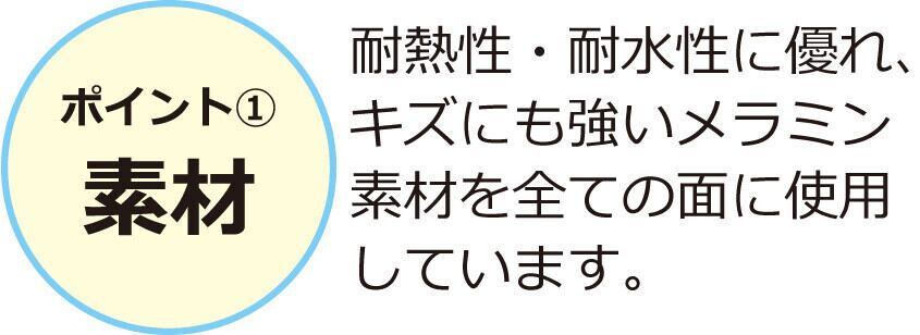 ●耐熱性・耐久性に優れキズにも強いメラミン素材を全ての面に使用。
