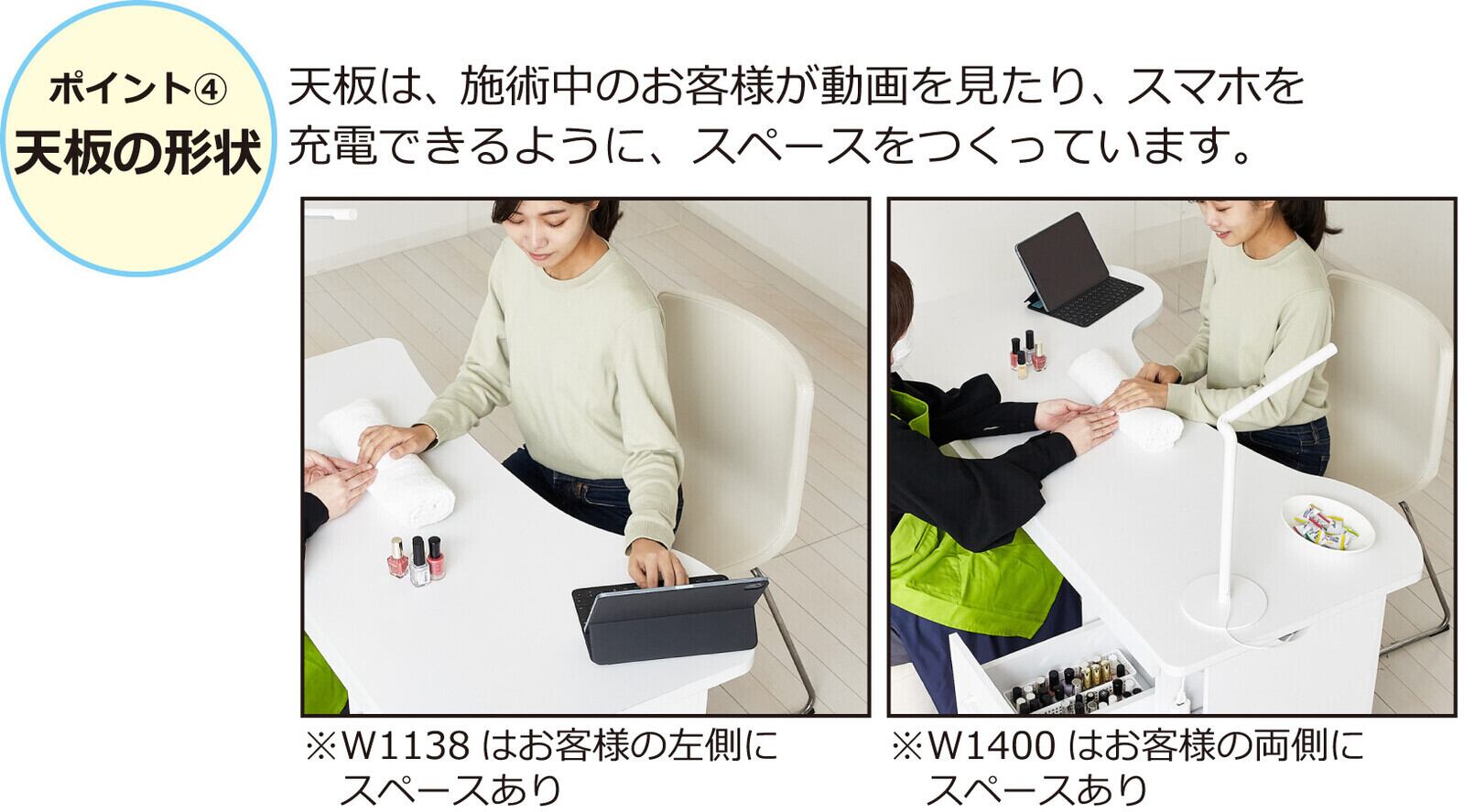 ●天板中央はネイル作業に適した奥行きの対面式デスク。