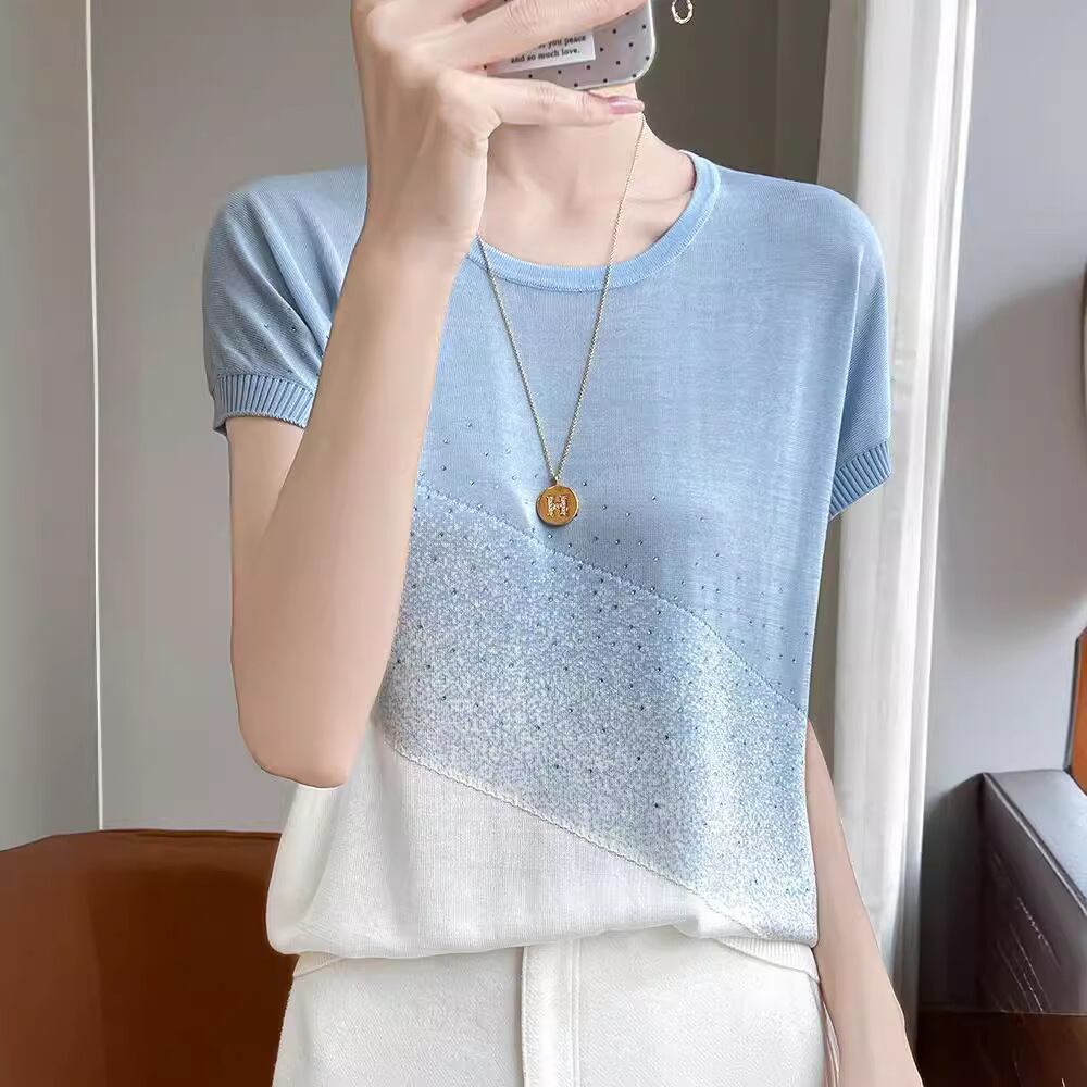 ●大人気の【中年女性のための夏のリヨセルニット半袖Tシャツトップス、グラデーションカラー】!この半袖Tシャツは、夏のスタイルにぴったりなデザインと快適な着心地を兼ね備えた一着で、日常のお出かけやカジュアルなシーンにも最適です。スタイリッシュなグラデーションカラーが、あなたの魅力を引き立てます!