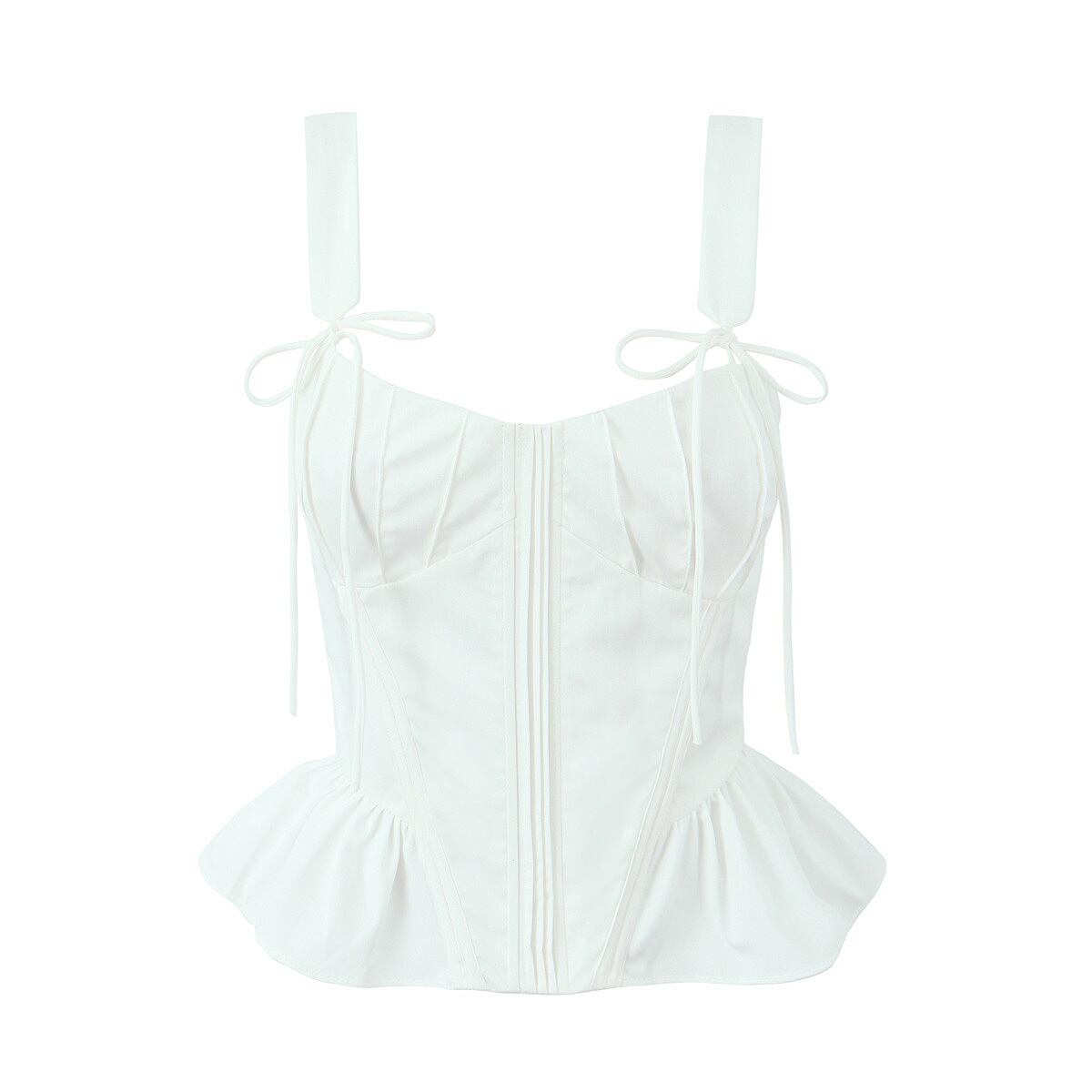 ●大人気の【ヨーロッパとアメリカのスタイル 女性の服 ファッショナブルなフリル ホワイトレースアップスリム カジュアルショートベストトップ】!このベストは、スタイリッシュなデザインと快適さを兼ね備え、カジュアルなシーンにぴったりな一着です。フリルとレースアップのディテールが、あなたのコーディネートを一層引き立てます!