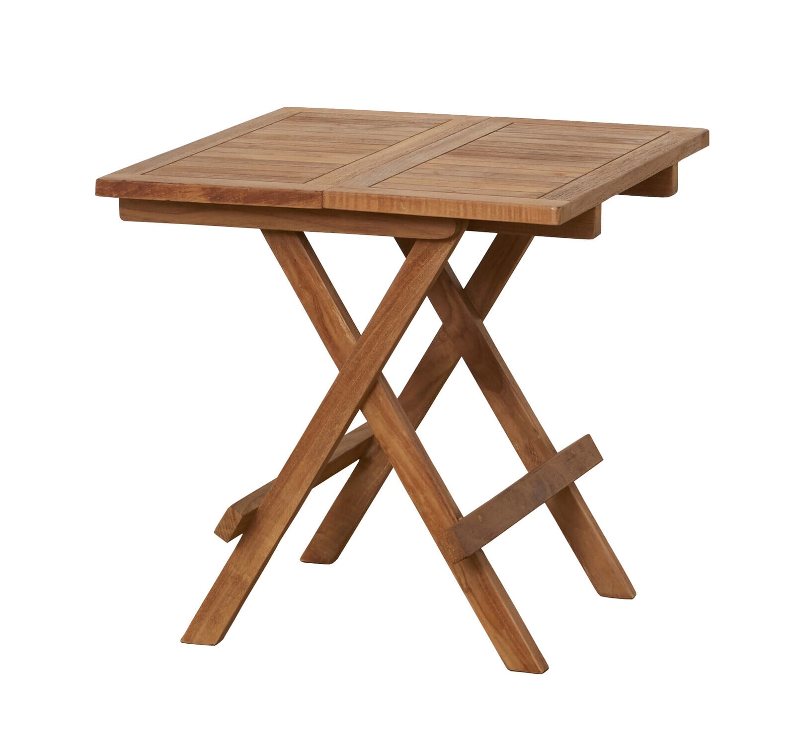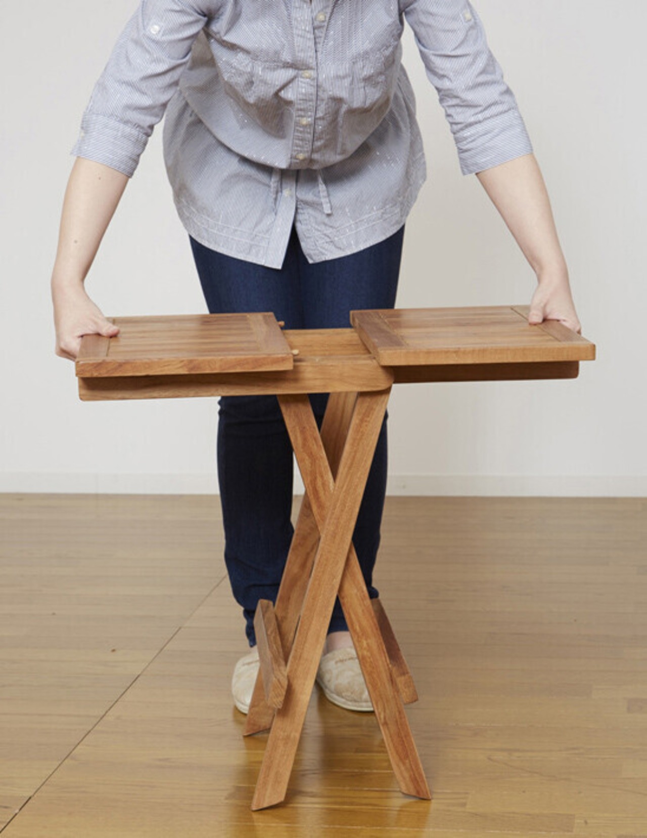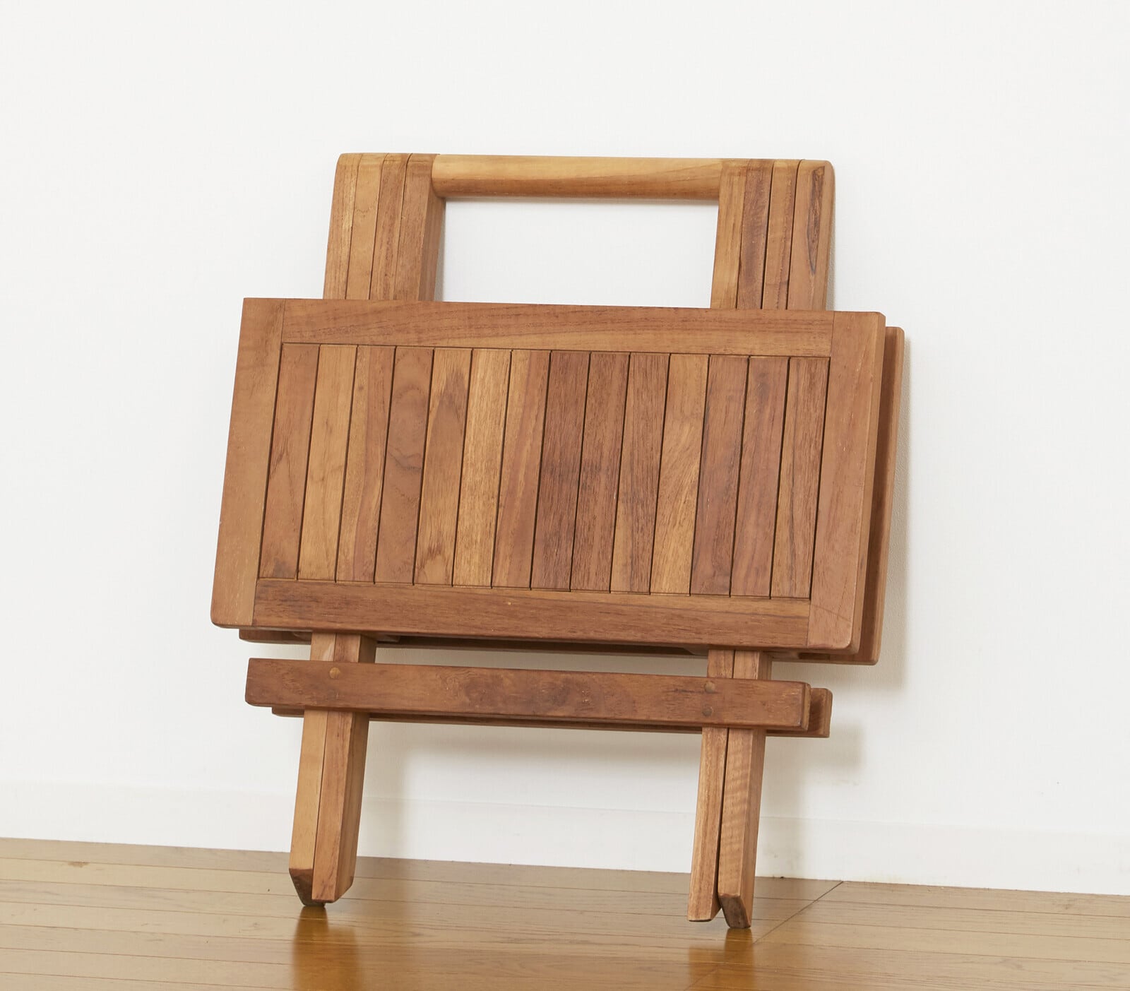 ●チーク材とは世界三大銘木の一つ。美しい木目と強靭な耐久性があり、家具材、彫刻材、船舶材、建築材などに使用されます。●折りたたんで狭いすき間にも収納できます。(折りたたみ時:約W50×H58×厚み7.5cm)●天然木の為、イメージ写真とは色や風合いが異なります。●別売りの折りたたみチェアー2脚組とあわせても◎●完成品