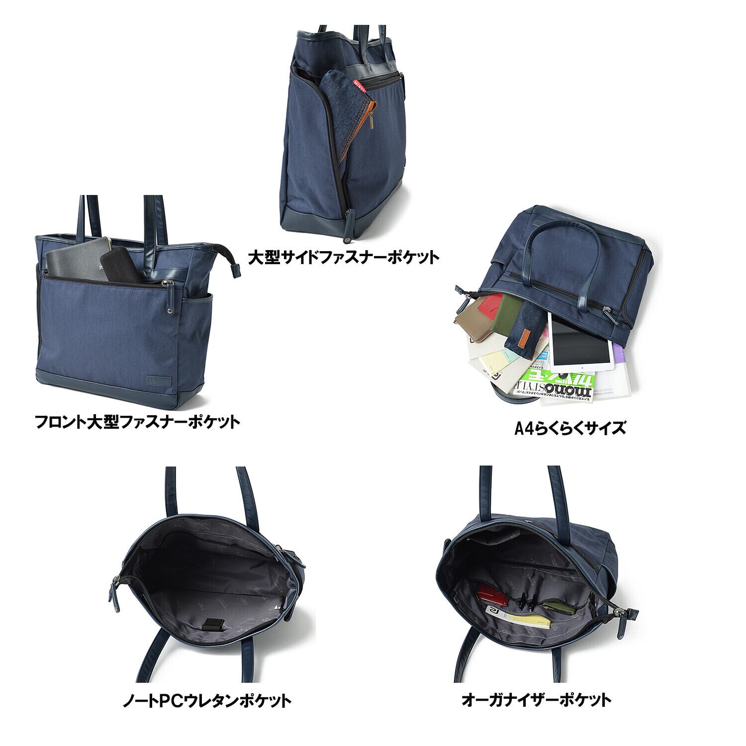 カジュアルからビジネスまで幅広く使えるトートバッグです。