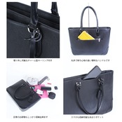 前面上部にはあおりポケット、背面にもファスナーポケットを配置し、ビジネスから日常使いまで幅広く活躍する万能トートです。