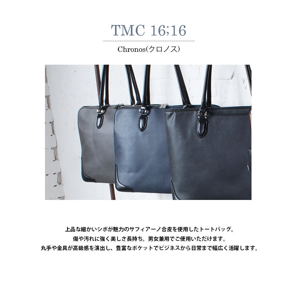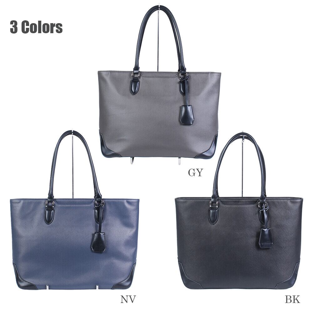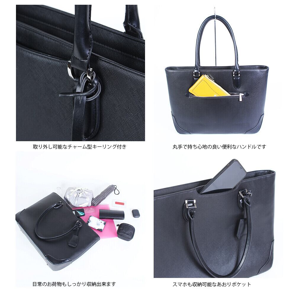 上品な細かいシボが魅力のサフィアーノ合皮をメイン素材に使用したトートバッグです。サフィアーノ合皮は傷や汚れ、水に強く、美しさを長く保てるのが特長。フラットな合皮とのコンビネーションがデザインのアクセントとなり、持ち手は手に馴染む丸手仕様で使い心地も抜群です。