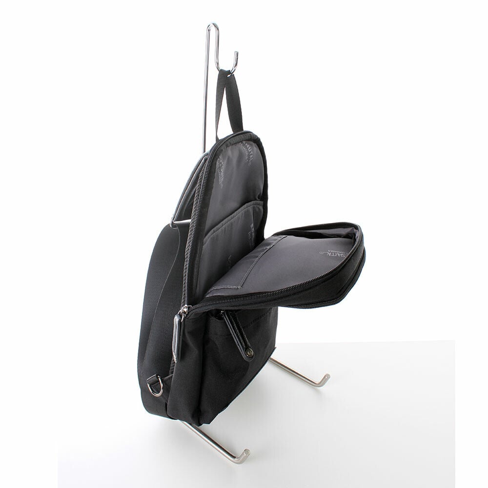 このスマートヘリンボンボディバッグは、モダンなヘリンボン柄とスマートなシルエットが特徴的なデザインです。サイズ調整可能なショルダー付け根部分には、上質なシボがポイントの合皮素材を使用しており、高級感を演出しています。また、左右どちらでも背負っていただきやすいように、ナスカンとDカンを本体下部に付けているため、背負い方の変換が臨機応変に行えます。 ボディバッグ上部の前側ポケットの内装にはオープンポケットが1個ついており、スマホなどを入れて取り出しやすくなっています。前面にもファスナーポケットがついているので、小物類などの収納が楽ちんです。メイン収納部には、前側にオープンポケットが1個、後ろ側にウレタンポケットが1個搭載されており、様々な用途でご利用いただけます。背面はメッシュ仕様になっているため、ムレなどを軽減してくれます。また、背面にはファスナーポケットも搭載されているため、小銭入れやICカードなどを入れて便利にご利用いただけます。 トップにはテープの持ち手が付属しており、満員電車での前持ちなどでも使える仕様です。メイン収納部にはA5ノートが入るため、ノートも入れていただけます。また、ウレタンポケットも搭載されているため、タブレットやスマートフォンなどの電子機器を入れることもできます。さらに、本体ヘリンボン素材は撥水も効いており、雨の日でも安心して使えます。デザインもミニマルで使いやすく、デイリー使いにもばっちりご利用いただけます。
