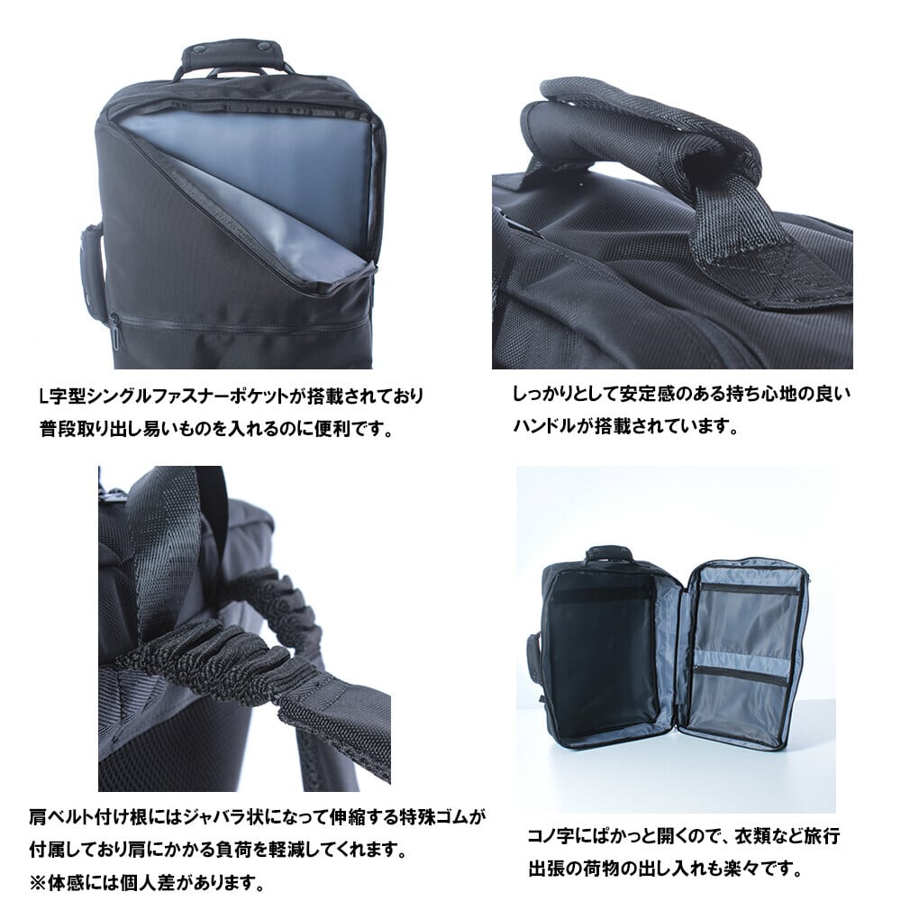 メインファスナーは開閉しやすいダブル仕様で、キャリーバッグの様にコノ字にぱかっと開くので、衣類など旅行や出張の荷物の出し入れも楽々です。