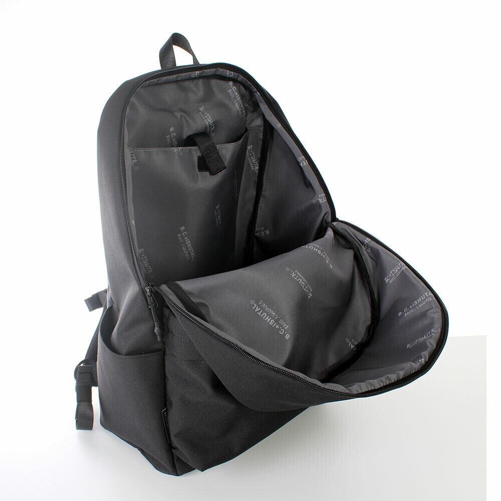 このデイパックは、裏PU加工が施された撥水ポリエステル素材で雨の日なども安心してお使い頂けます。前面の大き目なファスナーポケットが特徴的で、メイン収納部のファスナーも背面側から前側にかけて斜めに下がっている仕様になっているので前持ちでも使いやすく、物を出し入れするのも簡単です。両サイドにオープンポケットが2個ついていてペットボトルや雨傘も入れていただけます。長さ調節可能なチェストベルト付きの裏メッシュ肩ベルトを搭載しており体にもぴったりフィットさせることが出来ます。内装にはオープンポケットが1個付いているので、タブレットや資料なども分けていただける仕様になっています。引手のシリコンを先に加えた加工も、スポーティでスタイリッシュな印象を与えます。普段使いやワンマイルコーデにもお使いいただける汎用性も備えています。