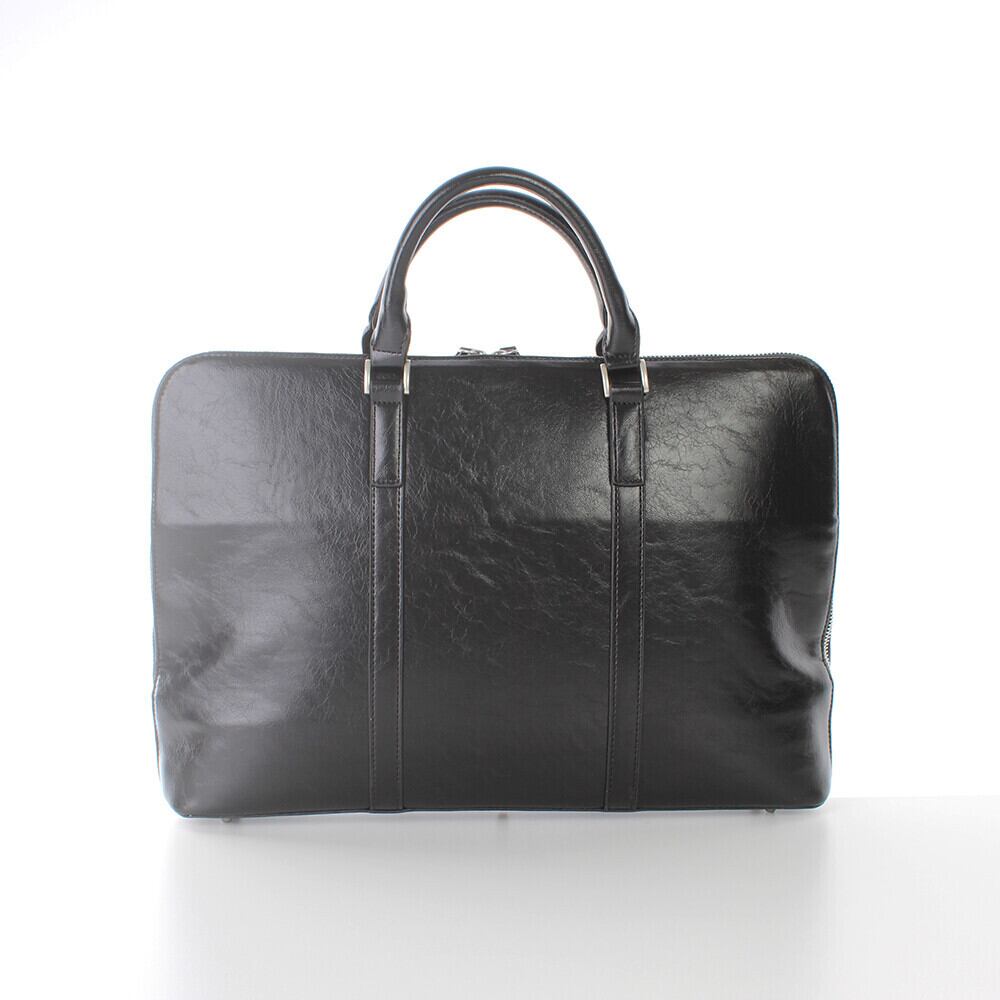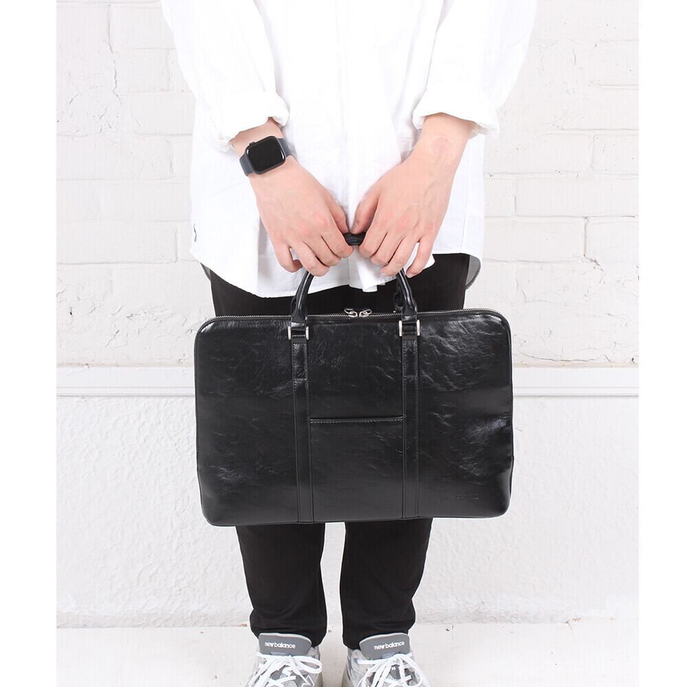 このブリーフバッグは、高級感がありながらも柔らかくしなやかな肌触りが特徴的なオイルレザー風PUレザーを使用しています。光沢があり、上品でクールな印象を与えます。また、丸手の芯のしっかりとしたトップハンドルが洗練された佇まいを演出してくれます。 メイン収納部は、大きく口の開くファスナー仕様で入れやすく、両サイドにササマチも付いているため、荷物が飛び出したりする心配はありません。内装は整理整頓しやすい仕様で、ファスナーポケットやオープンポケット、ペン差し、ウレタンポケットが備わっています。また、外側には1個のポケットがあり、スマホや定期などを入れることができます。底にはしっかりとした底板を入れており、金属の底鋲も付いているので、耐久性も抜群です。 このブリーフバッグは、13.3インチのノートブックやiPad、B4ノートなどを収納することができ、取り出しやすく機能的です。また、大きすぎず小さすぎない丁度いいサイズ感で、どんなスタイルにも合わせやすく、普段使いはもちろん、ビジネスシーンでも活躍することができます。