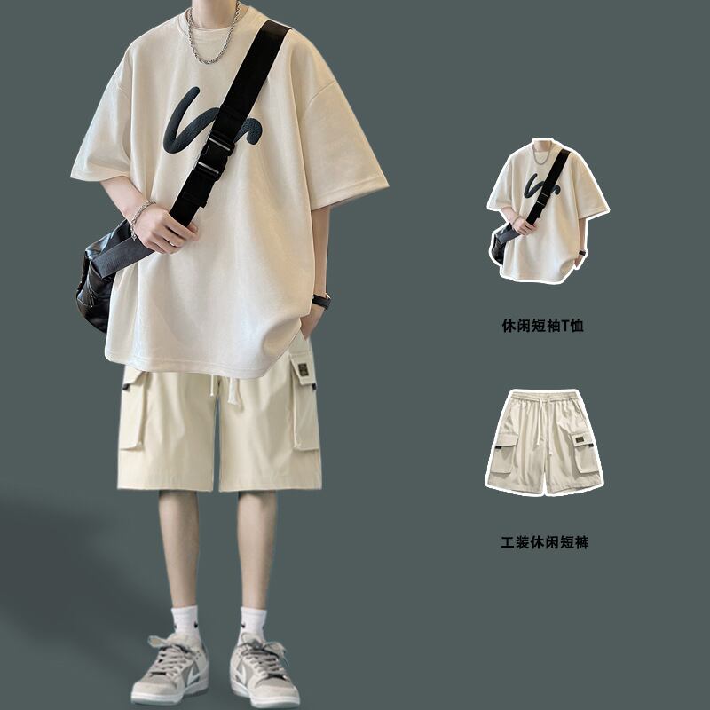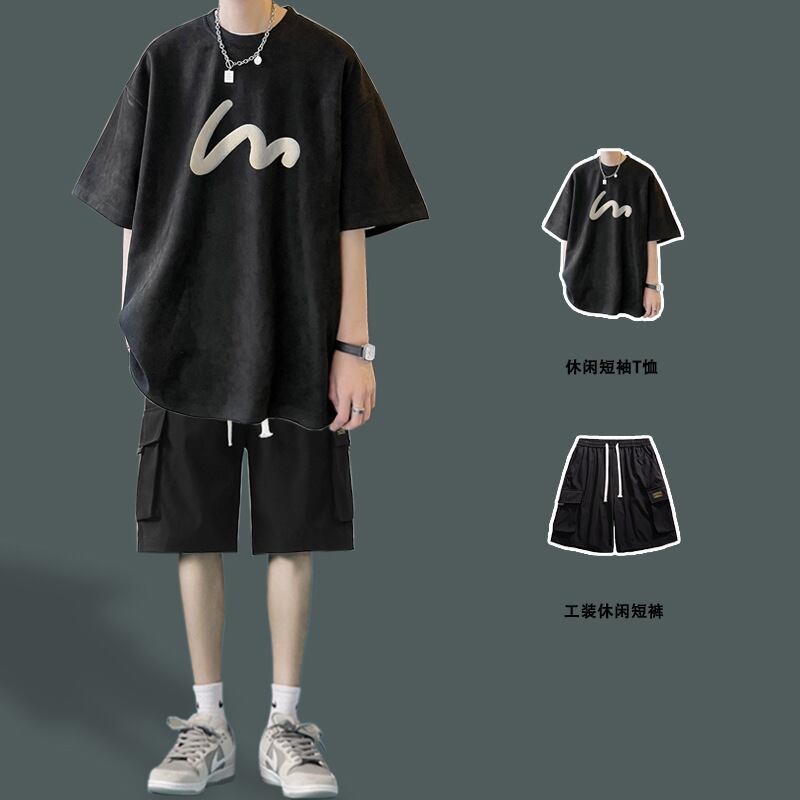 大人気の香港スタイルの半袖Tシャツとショートパンツのセット、メンズの夏のトレンドワークウェアです!リラックスした着心地を追求したゆったりとしたデザインで、日常使いやレジャーシーンに最適です。