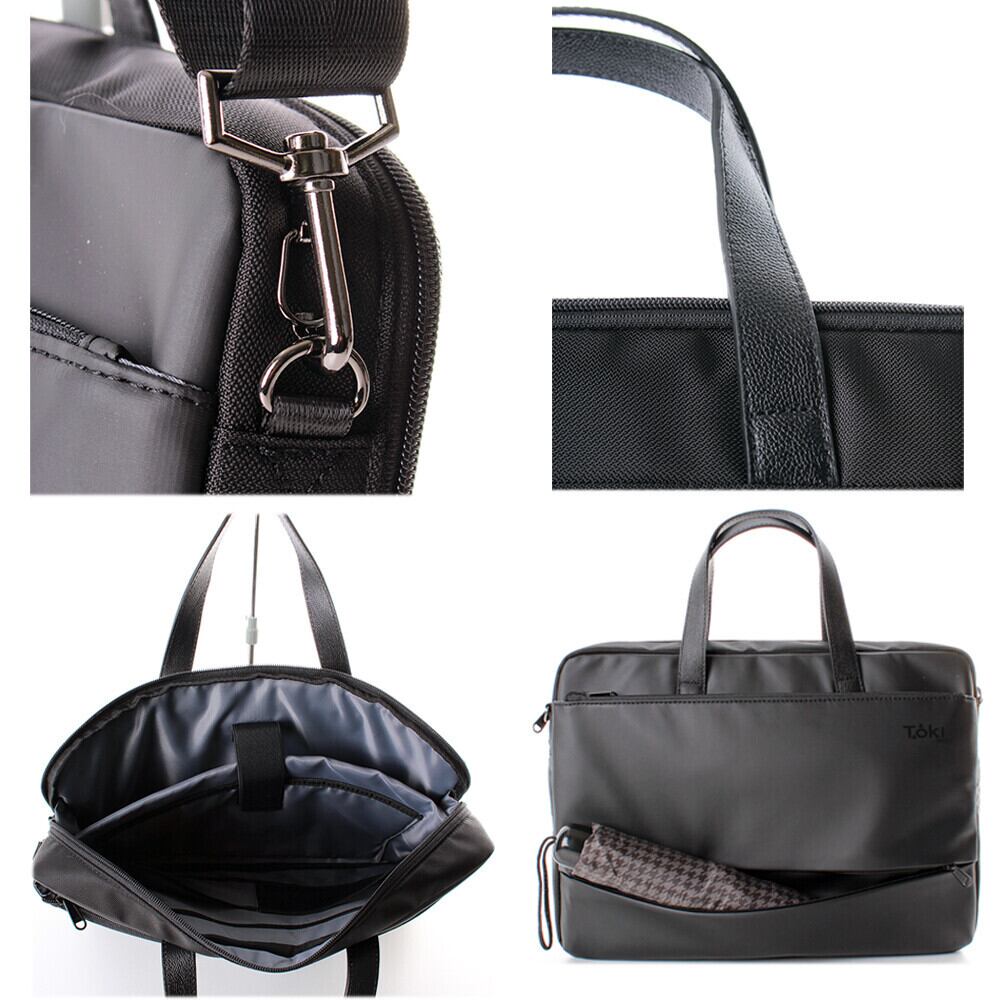 牛革のハンドルが高級感をアップさせ、シンプルな見た目とは裏腹に抜群の機能性を持ったブリーフバッグです。ビジネスにもカジュアルにも使えて、ブリーフ持ちとショルダー持ちを切り替えることのできる2WAY仕様。前面のポリウレタン素材は水に強く、軽量で、本体のナイロン素材も非常に頑丈に織られております。使用されている外面のファスナーはテープが撥水性の高いYKKのコーティングテープになっておりますので、スマホなどを入れても安心です。内装もパソコンポケット×1、スマホポケット×1、オープンポケット×1、メッシュポケット×1、ファスナーポケット×1と充実しており、前面下部のポケットには折り畳み傘もぴったり収納出来ます。その際に浸水を防ぐように、内装が水に強い素材となっております。キャリーバッグのお供にも出来る様にと、キャリーバーも搭載しております。様々なシーンで使える多機能スマート2WAYブリーフです。