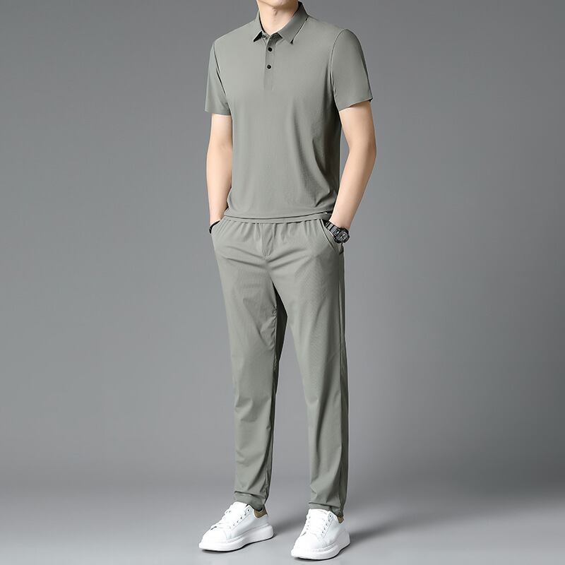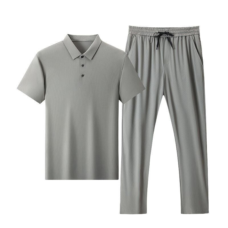 【大人気】高級100%桑絹スーツ メンズ アイスシルク シームレス 半袖ポロシャツ 夏中年パパカジュアルツーピーススーツの登場です!このスーツは、高級感あふれる100%桑絹素材を使用しており、サラリとした肌触りと優れた通気性が特徴です。夏の暑い日でも快適に過ごせるデザインが嬉しいポイントです。また、シームレスな作りがより一層、スタイリッシュで洗練された印象を与え、ビジネスシーンからカジュアルなお出かけまで幅広く活躍します!