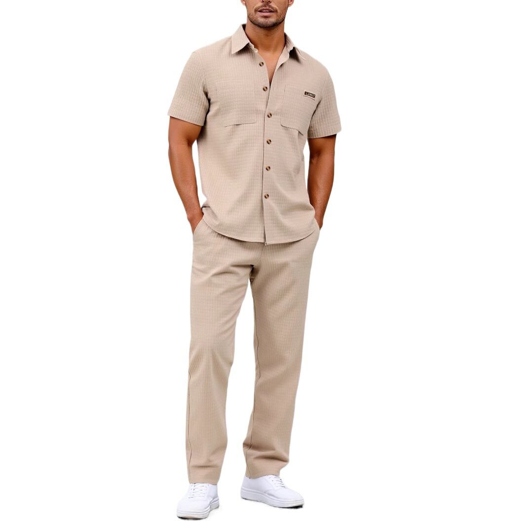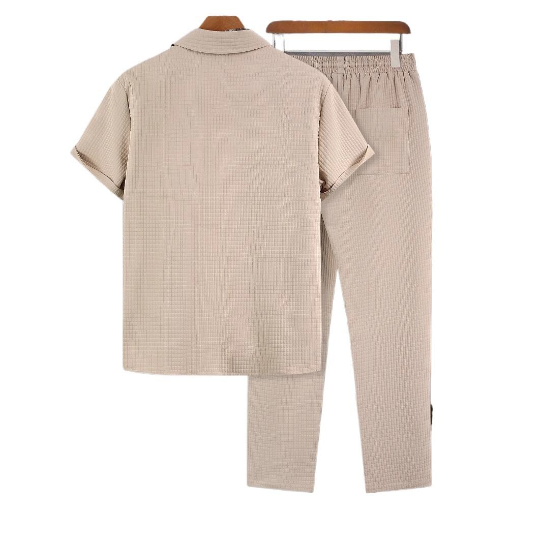 【大人気】越境貿易 メンズ服 テクスチャパンチェック 半袖シャツラペル ズボン ツーピーススーツ スポーツメンズの登場です!このツーピーススーツは、テクスチャパンチェックデザインを取り入れ、スポーティな雰囲気を演出します。軽やかで動きやすい素材を使用しており、リラックスしたスタイルで快適に着用いただけます!カジュアルなシーンからお出かけまで幅広く活躍するデザインが魅力です。