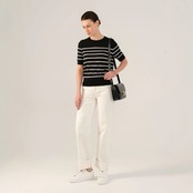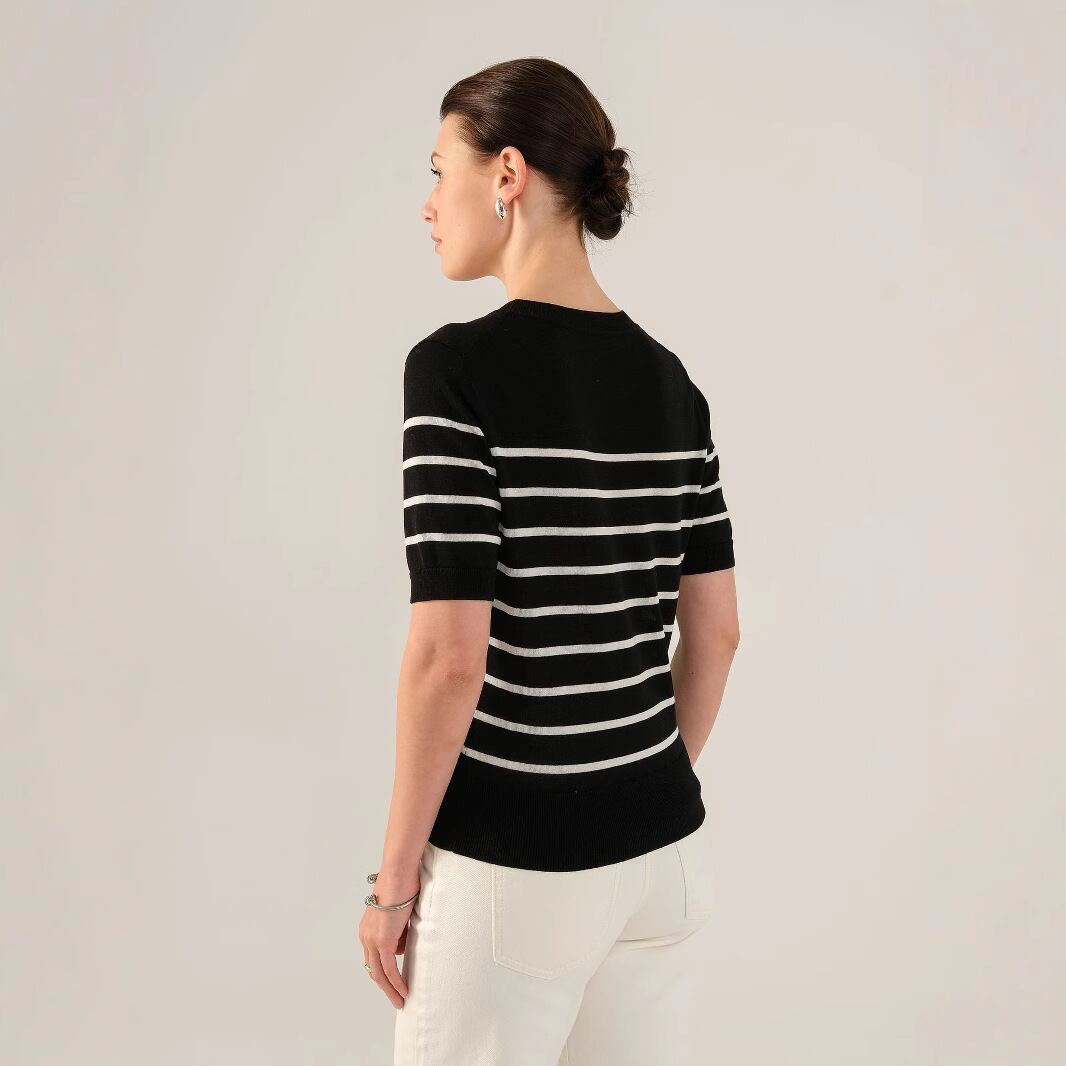 【大人気】ラウンドネックのクラシックなストライプ柄ニット 半袖 春夏新作レディースカジュアルショート薄手プルオーバートップスの登場です!この魅力的なトップスは、ラウンドネックデザインが特徴で、シックなストライプが春夏の装いにぴったりの一枚です。軽やかで薄手の素材感が、カジュアルな日常から特別なシーンまで幅広く活躍するアイテムとなります!