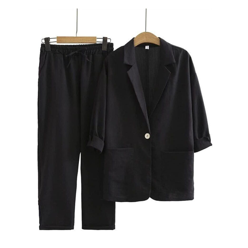 特筆すべきは、シンプルで無地なデザイン。コーディネートの幅を広げ、さまざまなシーンで活躍します。特別な日だけでなく、普段使いにも最適です。おしゃれでありながら、どこか心地よさを感じさせるこのスーツは、あなたのカジュアルスタイルを引き立てます。