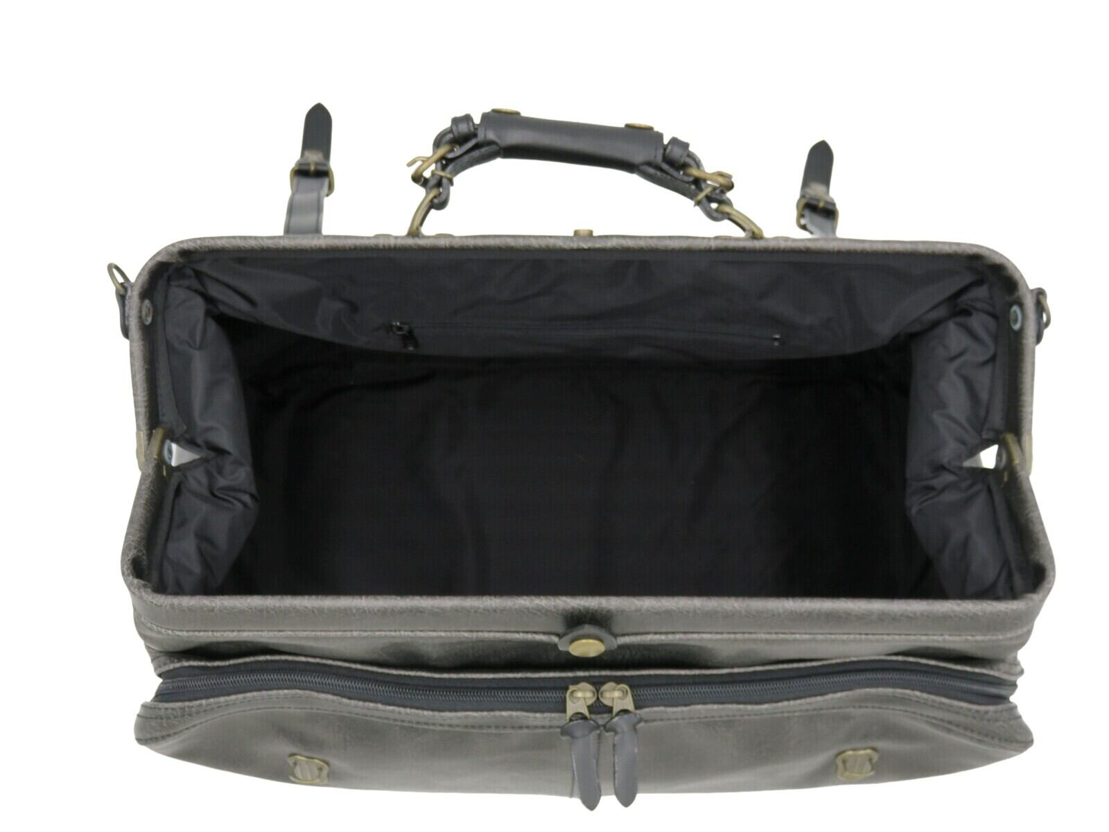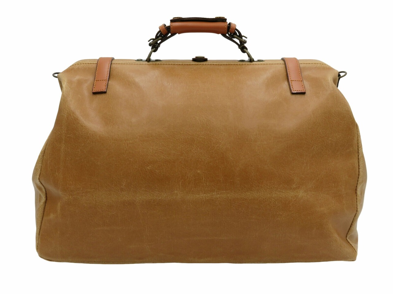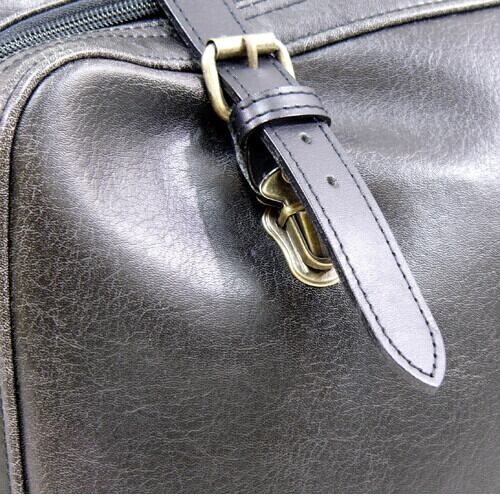 開口部に枠が仕込まれたダレスタイプのボストンバッグで、限られた職場でしか作れなくなってきている逸品です。ダレスタイプの良い所はカパッと開いた状態を保つ事が出来る所で、荷物の出し入れがしやすくなっています。開閉は、2本のベルトに取り付けられている差込式の錠前をそれぞれ外し、口枠に取り付けられたホックを外して行います。