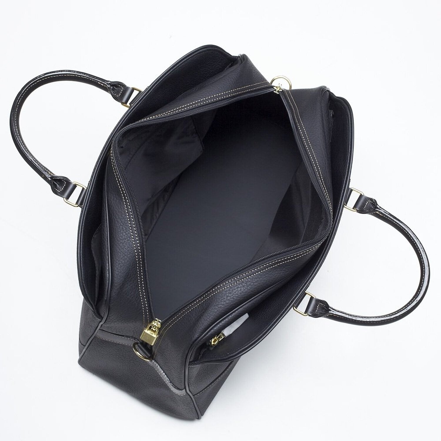 本体開口部の前側と後ろ側には雑誌や新聞などを入れる事が出来るオープンポケットが付いています。もちろんいつも手にするハンドルや、ファスナーの引き手は本革製で使うほどに手になじんできます。ショルダーベルトも付いているので荷物が重いときでも楽に移動できます。