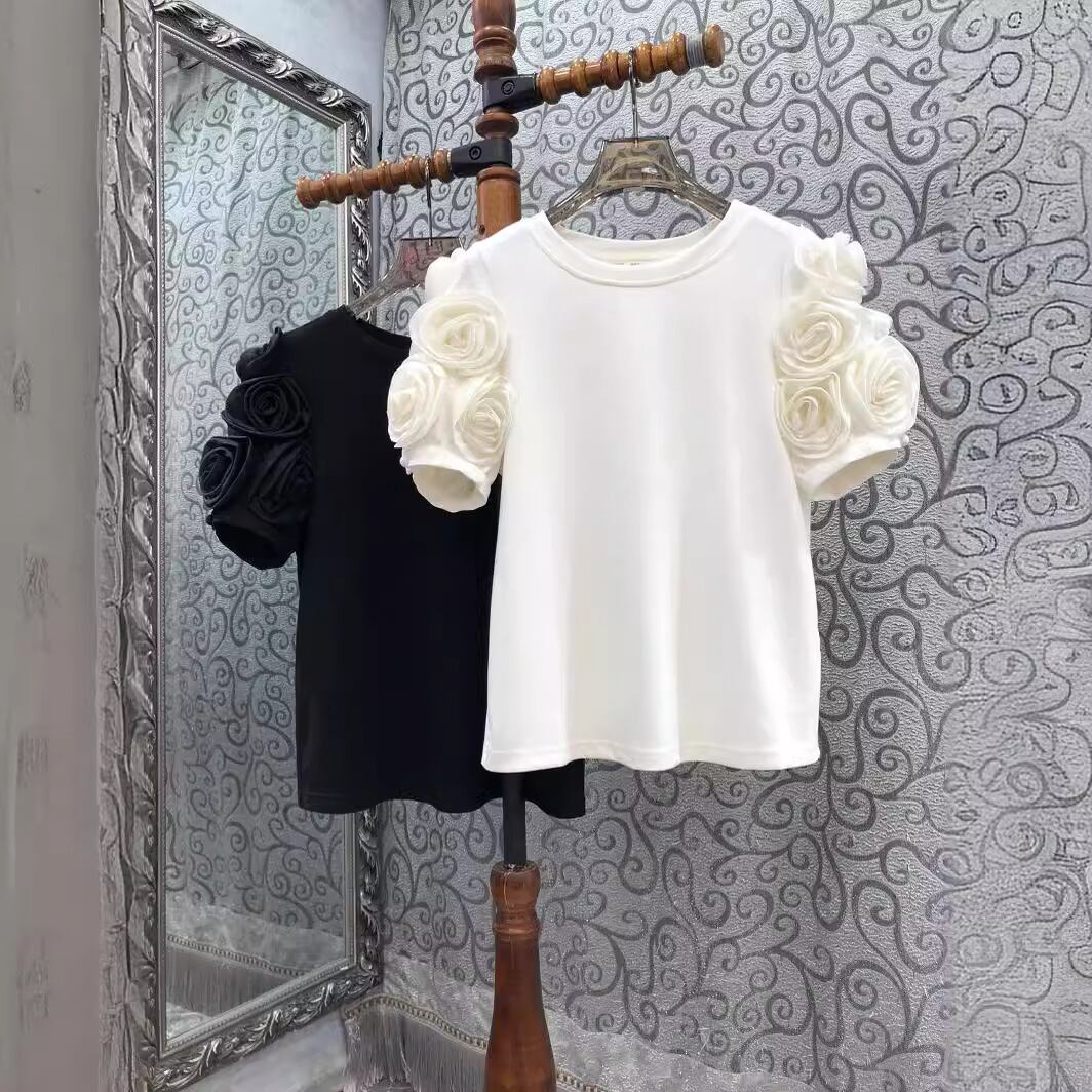 【大人気】夏の新作ヨーロッパ 婦人服立体花 半袖Tシャツのご案内です!このエレガントな半袖Tシャツは、立体的な花のデザインとシンプルなスタイルが特徴で、爽やかな夏のコーディネートにぴったりなアイテムです。