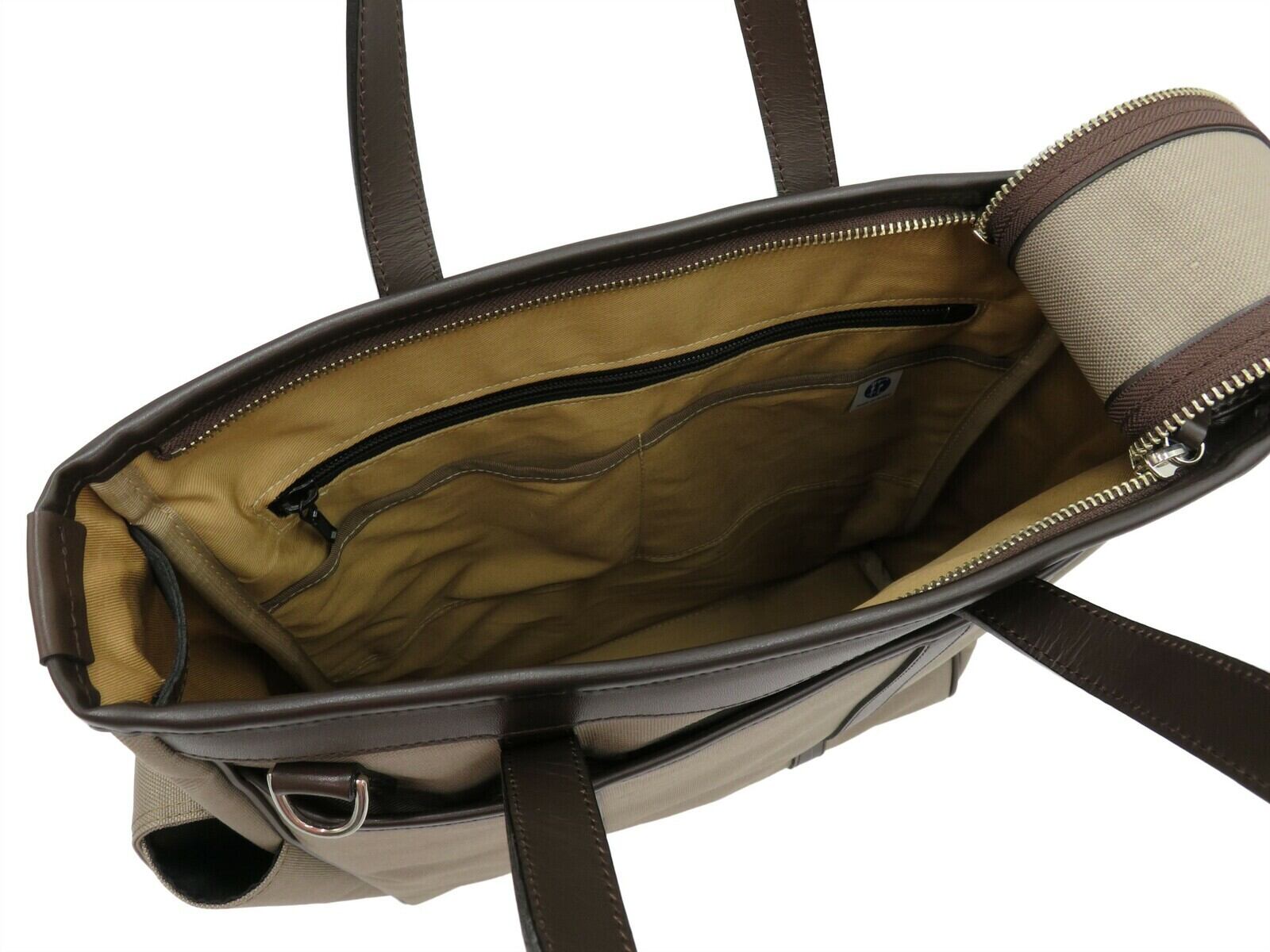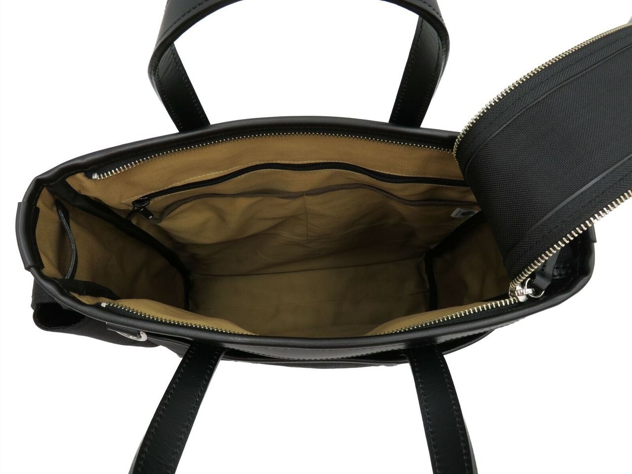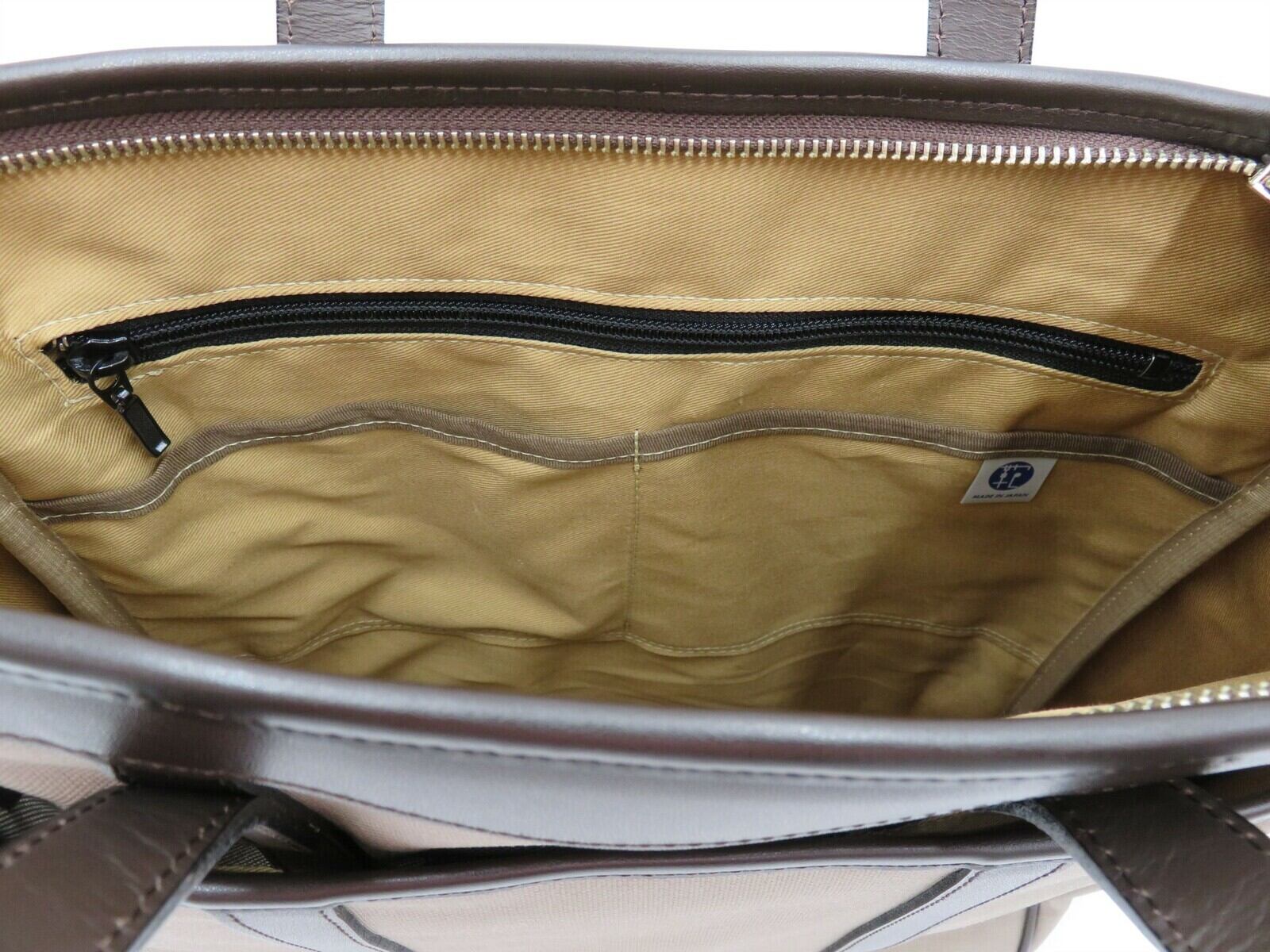 本体内部は細かく作り込まれていて、各種ポケットに携帯電話入れやペン差も付いています。本体左側面には小型のペットボトルなら収納可能なかぶせポケットが1つ付いています。ハンドルやファスナーの引き手は本革製で使うほどに手になじんできます。底面には本体を傷や汚れから守る鋲が付いているので、置き場所も気になりません。
