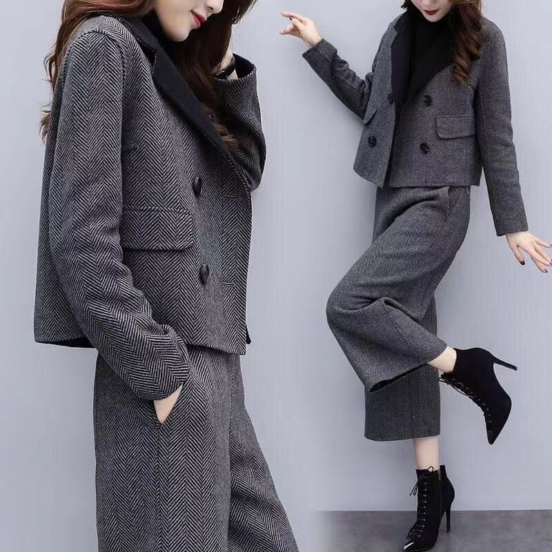 【大人気】新しい女性の秋と冬 ツーピースのズボン ヘリンボーン ウールコート ワイドレッグパンツ スリムファッションスーツ女性のご紹介です!洗練されたデザインが特長のこのアイテムは、季節感あふれるスタイルを演出するファッションの必須アイテムです。