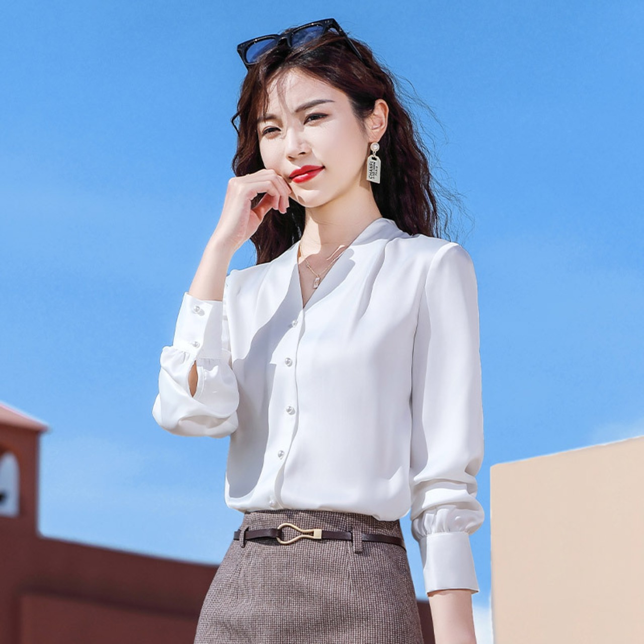 このVネックデザインのアセテートサテンシフォンシャツで、あなたのコーディネートに新たな魅力を加えて、おしゃれを存分に楽しんでください!多彩なシーンでの活躍をご期待ください!