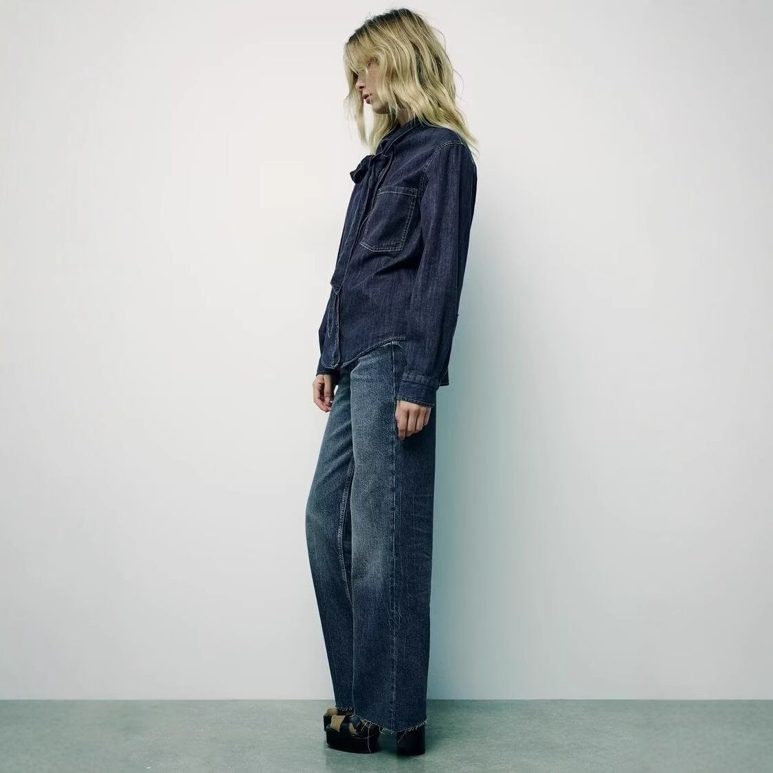 このリボン飾り付きデニムシャツで、あなたのコーディネートに新たな魅力を加えて、おしゃれを存分に楽しんでください!多彩なシーンでの活躍をご期待ください!