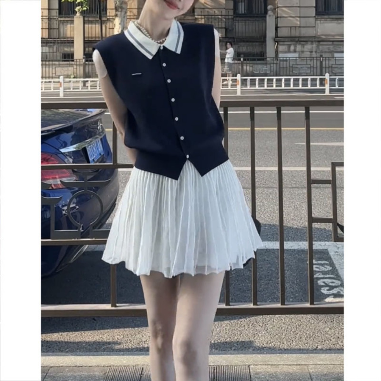 デザイン/ノースリーブボタンダウンポロカラーセーター + ホワイトショートスカート