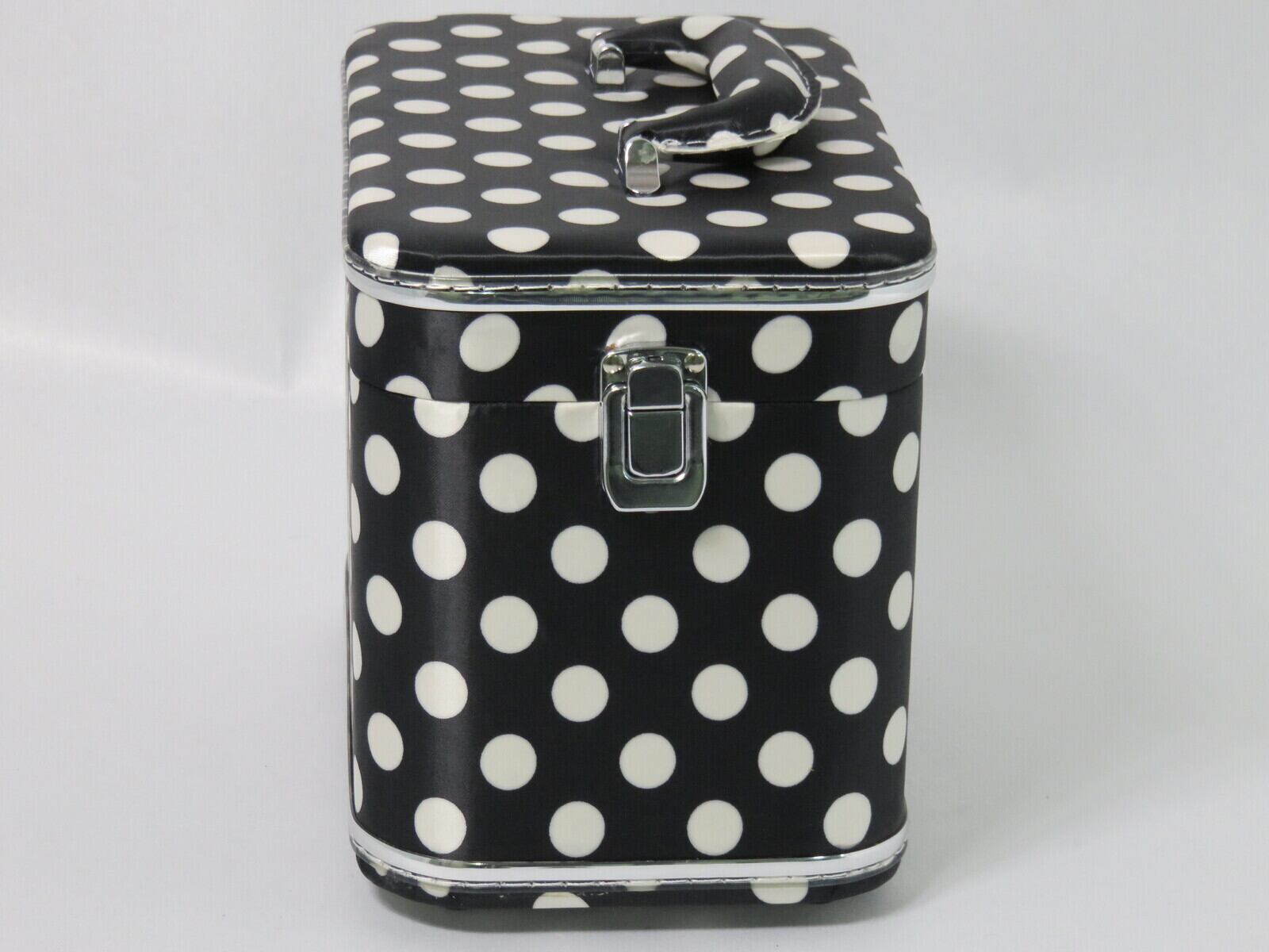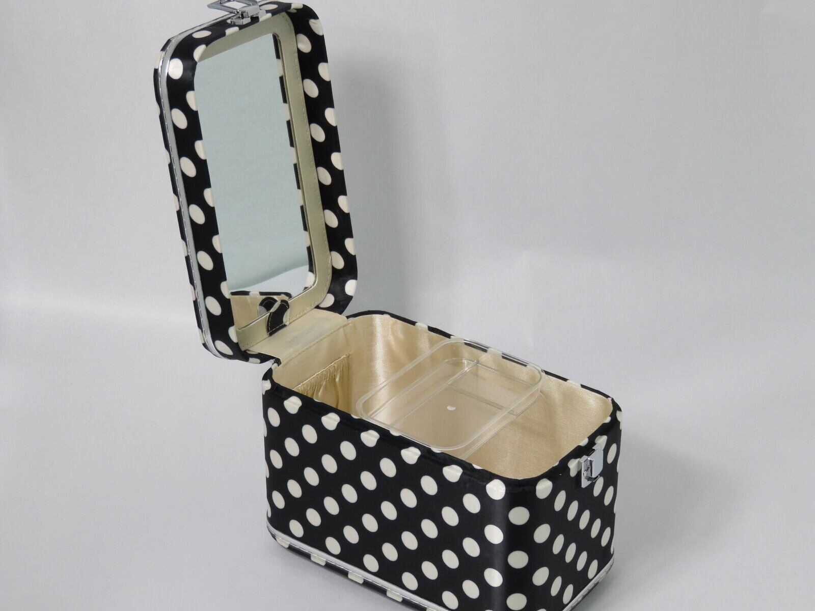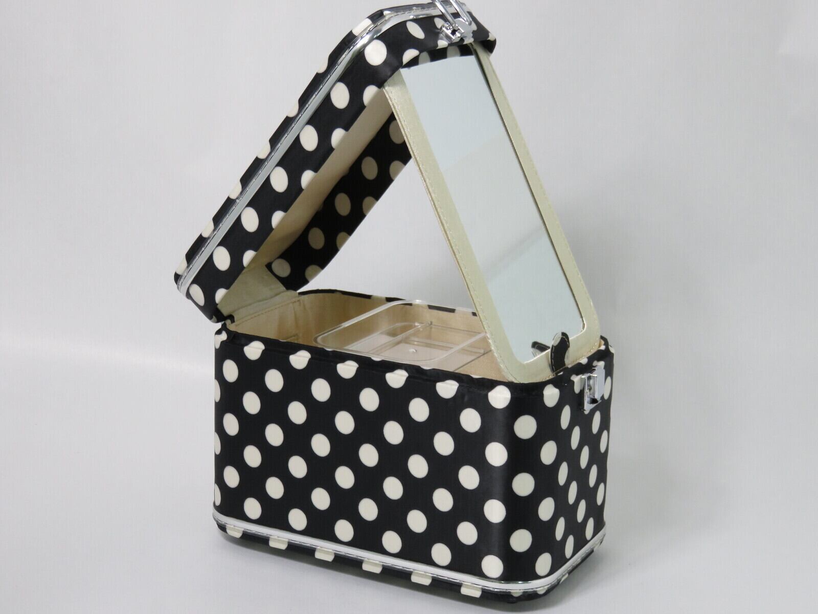 女性の味方!1家に1つあると便利なコスメケースです!水玉柄がお客様のハートを鷲掴みです。時代や年代に左右されない定番柄の商品です。暑い時、寒い時、お薦めなのはお化粧品をひとまとめにして、どこでも持っていけること。快適な部屋で、エアコンの冷気にあたりながら、はたまたコタツに入って・・・とっても便利です!普段あまり見られたくない化粧道具をひとまとめできます。中皿も付いていて、こまごまとしがちなコスメグッズや、ヘアピン、ヘアゴムもまとめられて、これひとつで、どこでもメイク完了です。この水玉柄のみ限定で、画像の様に鏡が前方に倒せる可動式タイプとなっております!(他の柄は鏡固定式です。)