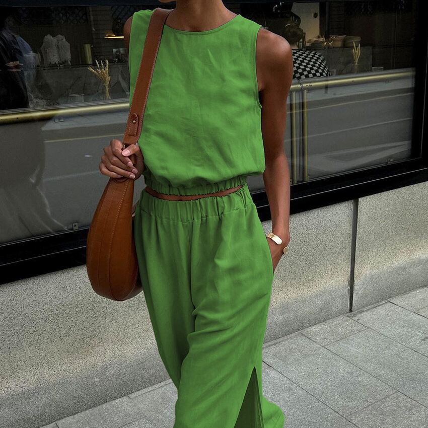 大人気の【コットンリネンのノースリーブベスト スリット ワイドレッグパンツ ズボンスーツ ヨーロッパとアメリカの春と夏のカジュアルファッションツーピーススーツ婦人服】は、春夏のコーディネートにぴったりなトレンドアイテムです。カジュアルながらもエレガントな印象を与えるこのスーツは、日常使いからお出かけまで幅広く活躍します。