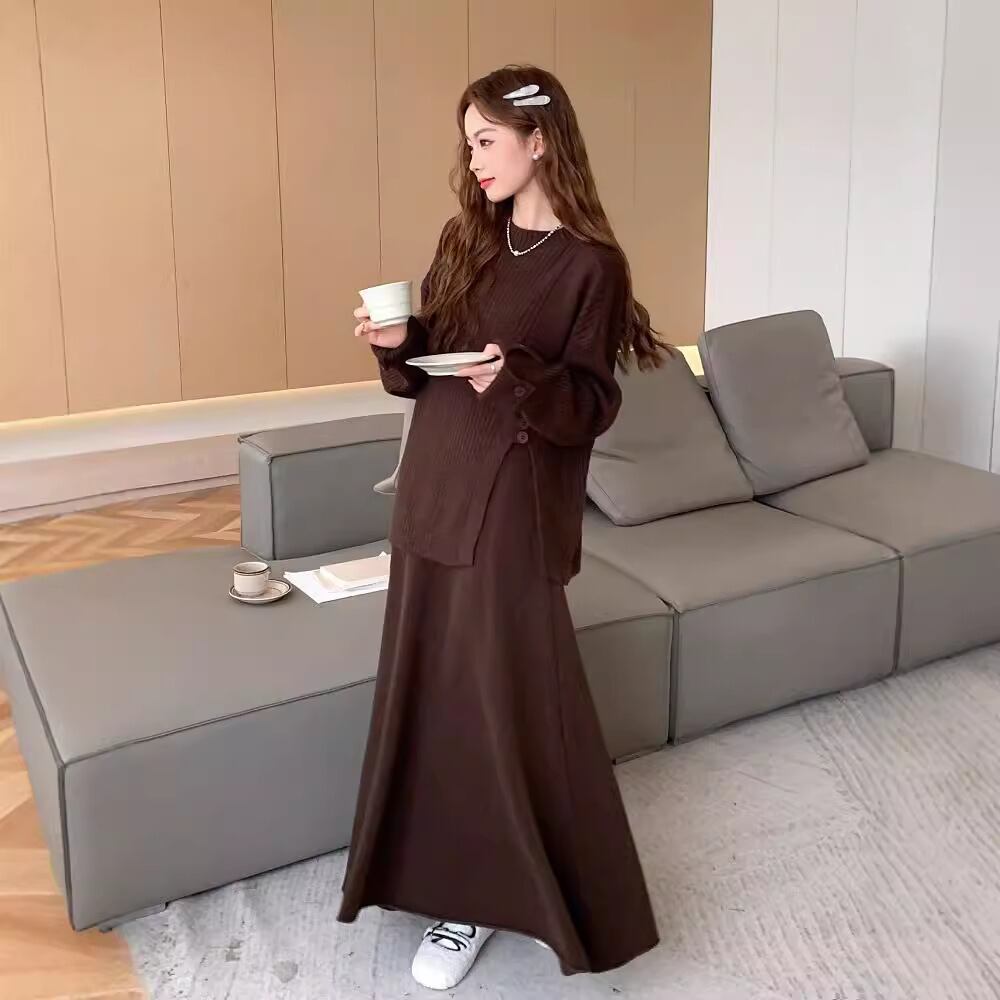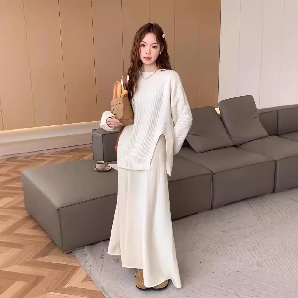高品質なニット素材を使用しており、とても柔らかく肌触りが良く、暖かさを保ちながらも軽やかな着心地が魅力です。ラウンドネックとスリットのディテールが、女性らしい魅力を引き立て、シンプルながらも存在感のある一着に仕上がっています。このツーピーススーツは、多彩なコーディネートが可能で、クローゼットの中で必ず活躍するアイテムです。
