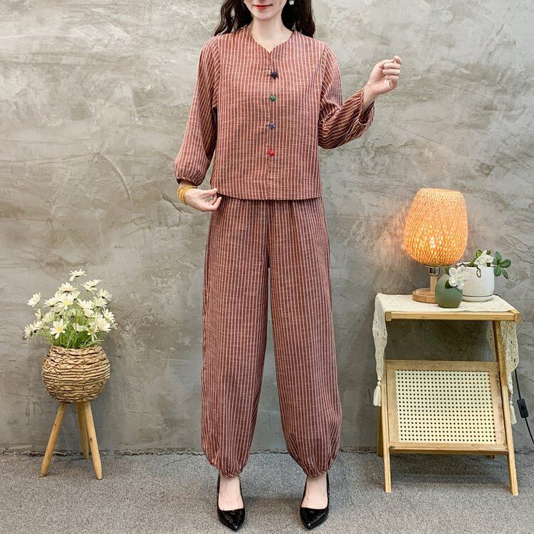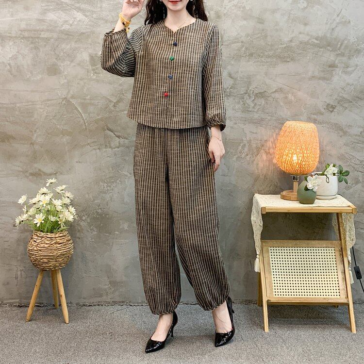 大人気の【大人気】綿麻ストライプ 春秋ママスーツ おしゃれ ゆったり スリミングカジュアル カバー 長袖 パンツツーピーススーツは、春秋の季節にぴったりなスタイリッシュで快適なアイテムです。このツーピーススーツは、トレンド感あふれるストライプデザインと、リラックス感のあるゆったりとしたシルエットが特徴で、日常のお出かけから特別なシーンまで幅広くご利用いただけます。