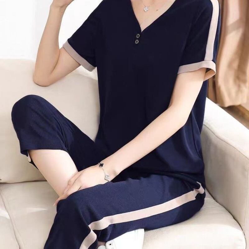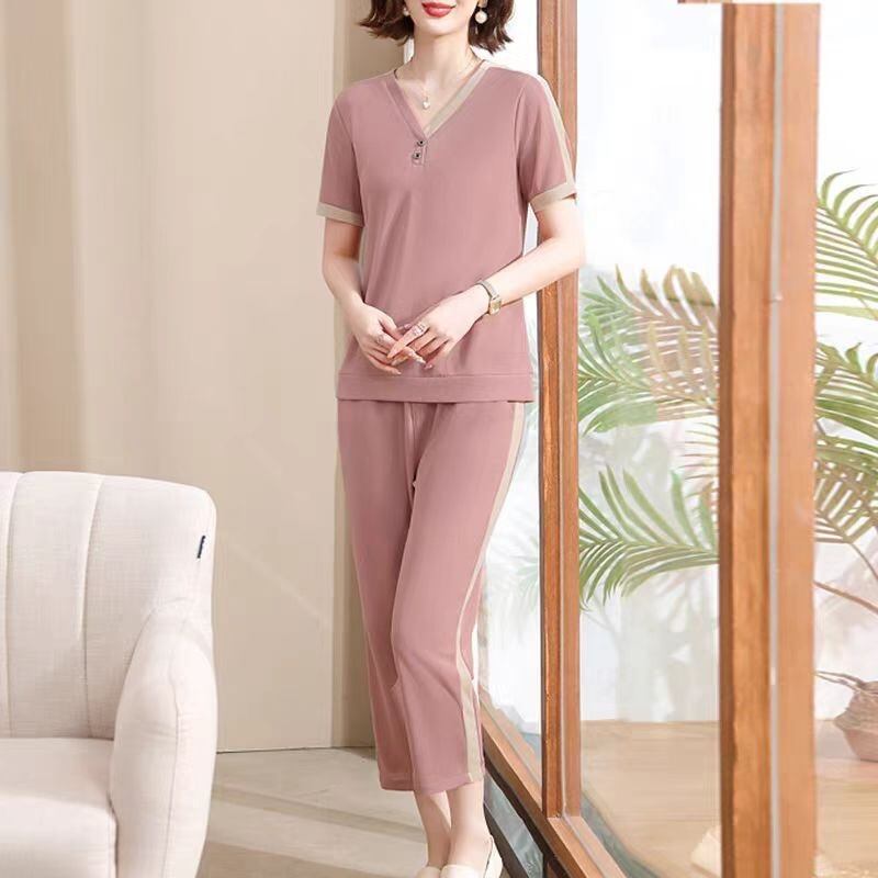 大人気の【大人気】夏のファッションとスタイリッシュな中高年母親のレジャースーツ 若見え、スリムにするVネックの肌に優しい万能ツーピースの薄いは、優れたデザインと快適さを兼ね備えた魅力的なアイテムです。このツーピースは、夏の爽やかな季節にぴったりで、お出かけやリラックスタイムに最適な選択肢です!