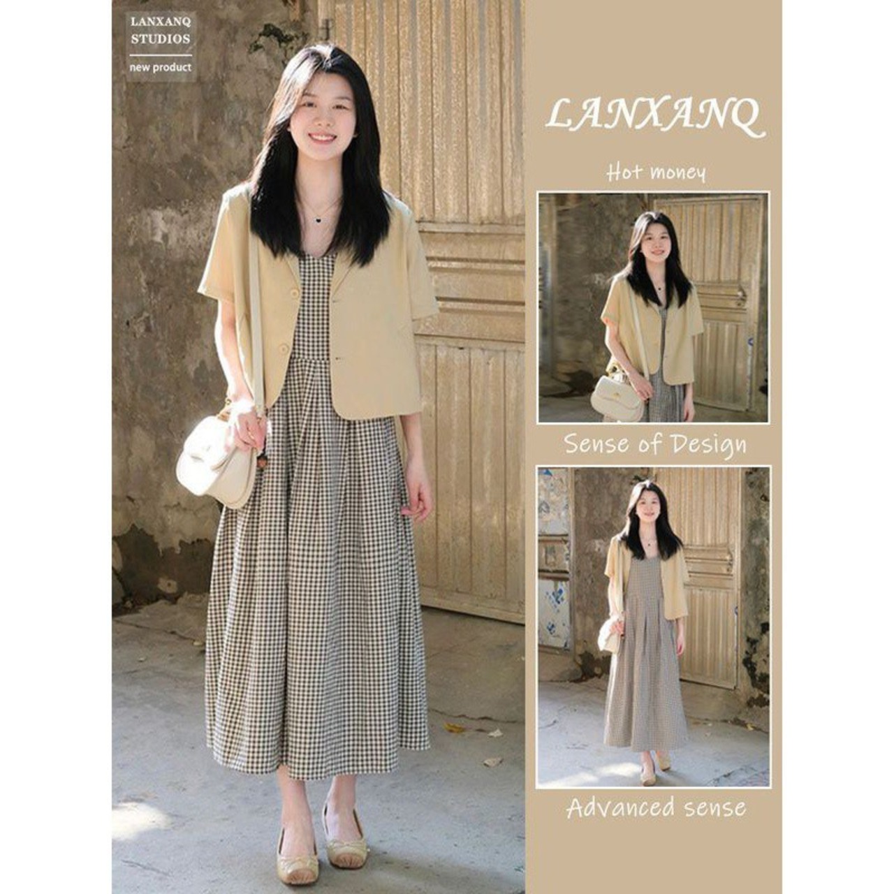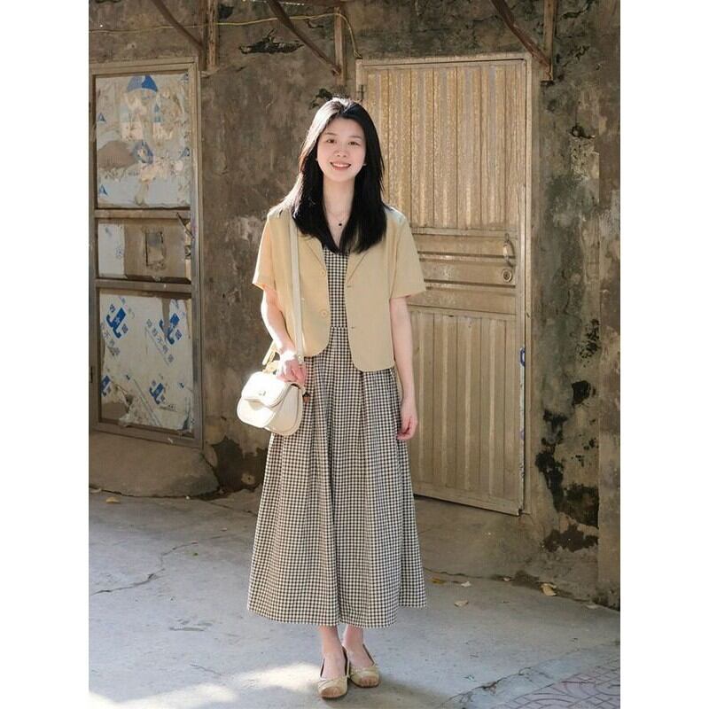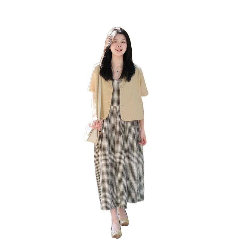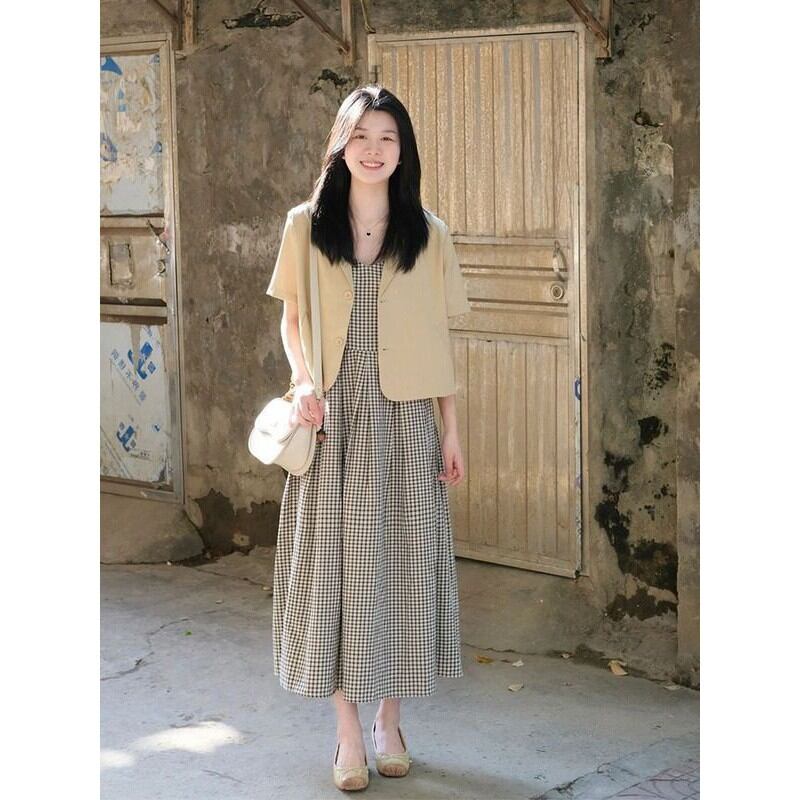 大人気の【大人気】夏の新作 シンプルな半袖 スーツジャケット ファッションレトロチェック柄 サスペンダードレスツーピーススーツ女性トレンドは、シンプルでありながらも洗練された印象を与える魅力的なアイテムです。このスーツは、暑い季節にぴったりの通気性の良いデザインで、カジュアルなお出かけや特別なイベントでも大活躍します!