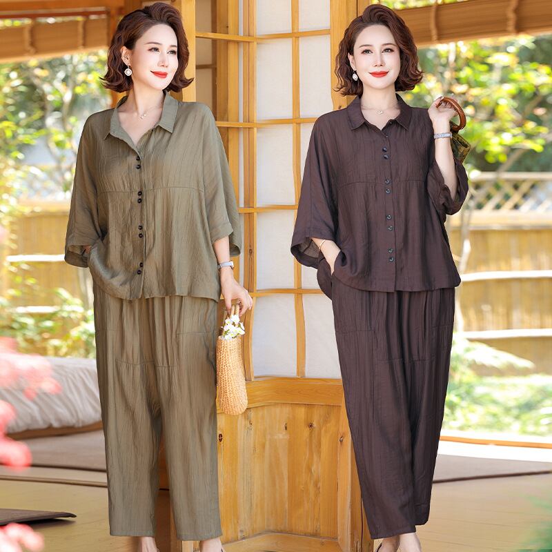 大人気の【大人気】母の夏の半袖 中年女性のスーツ 夏の新しいスタイル スタイリッシュな若見え 大きいサイズの女性のゆったりとした腹をカバーするツーピーススーツは、暑い夏にぴったりのスタイリッシュなアイテムです。このツーピースは、カジュアルなお出かけからちょっとしたお集まりまで幅広く活躍します!