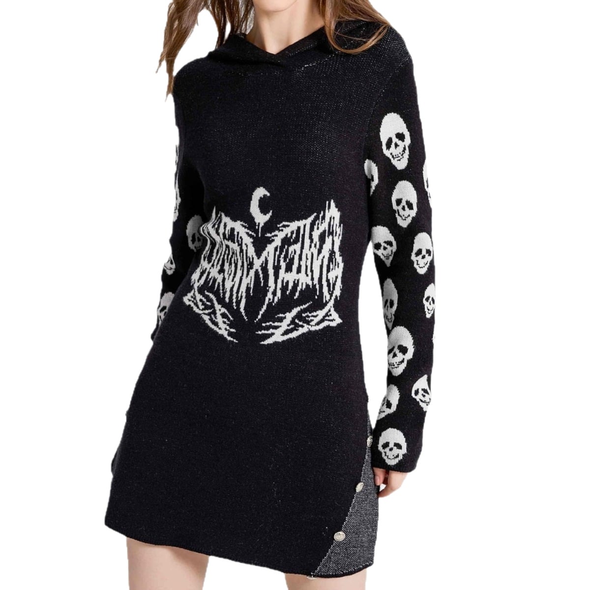 高品質なニット素材を使用しており、保温性と柔らかさを兼ね備えた着心地を実現。フード付きの独特なデザインは、遊び心がありながらも、クロスボーダーのパターンとスカルのプリントがゴシックな雰囲気を演出し、他にはない存在感があります。このアイテムは、あなたのワードローブにぜひ加えたいトレンド感あふれる一着ですので、見逃さないようにしましょう!