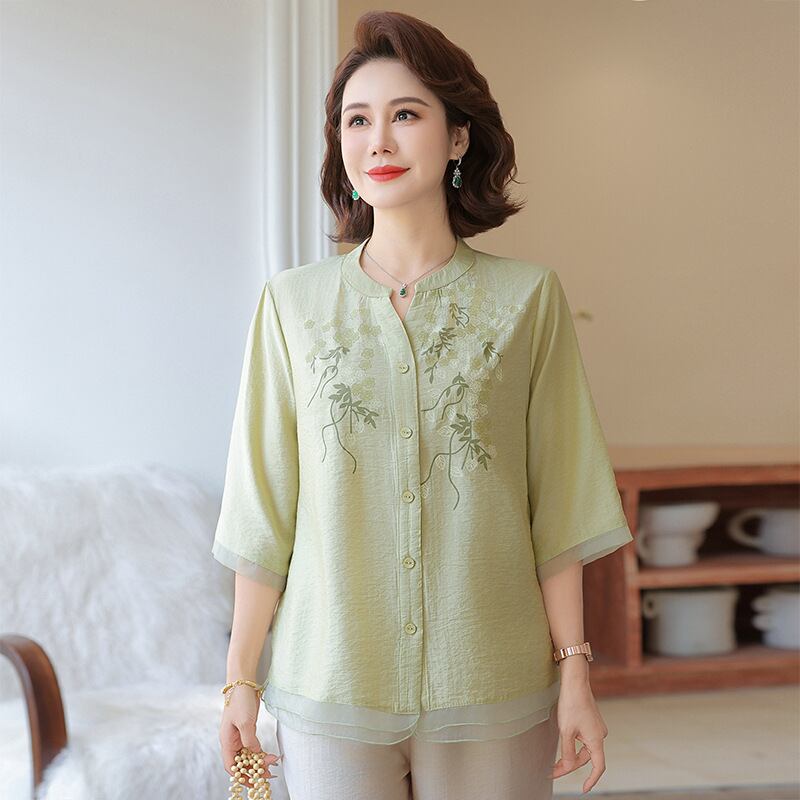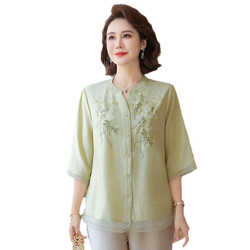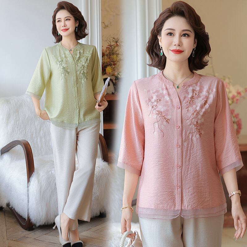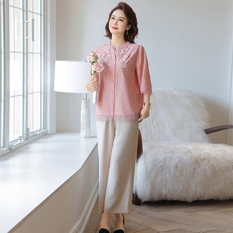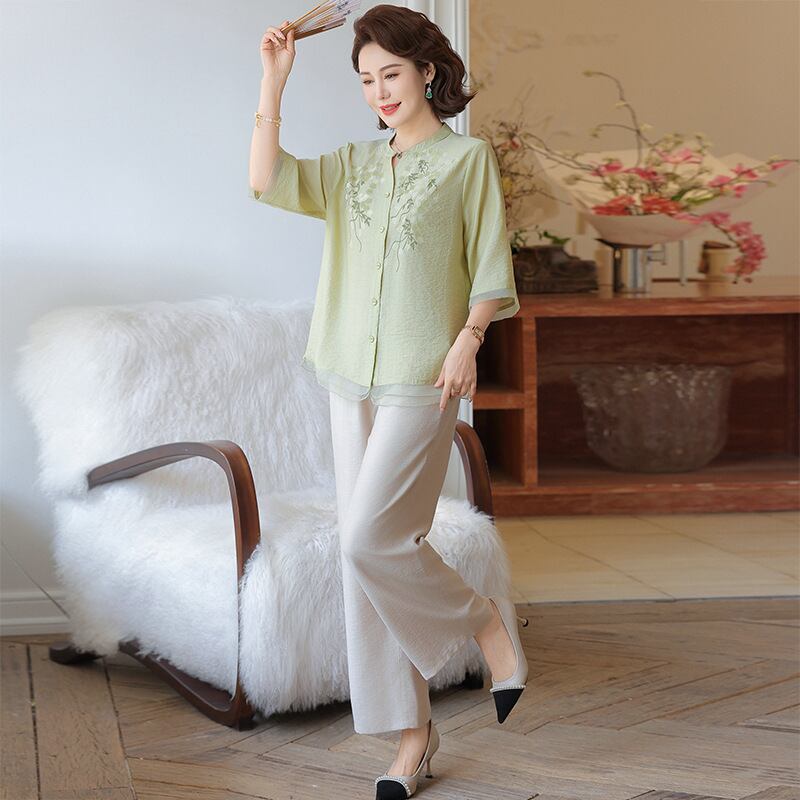 大人気の【大人気】中高年のお母さんの夏のスーツの女性 新しいスタイルのスタイリッシュなプリント 半袖シャツ綿と麻のワイドレッグパンツのツーピーススーツは、洗練されたデザインと驚きの快適さを兼ね備えたアイテムです。このスーツは、夏のお出かけや特別な集まりでも大活躍すること間違いなしです!