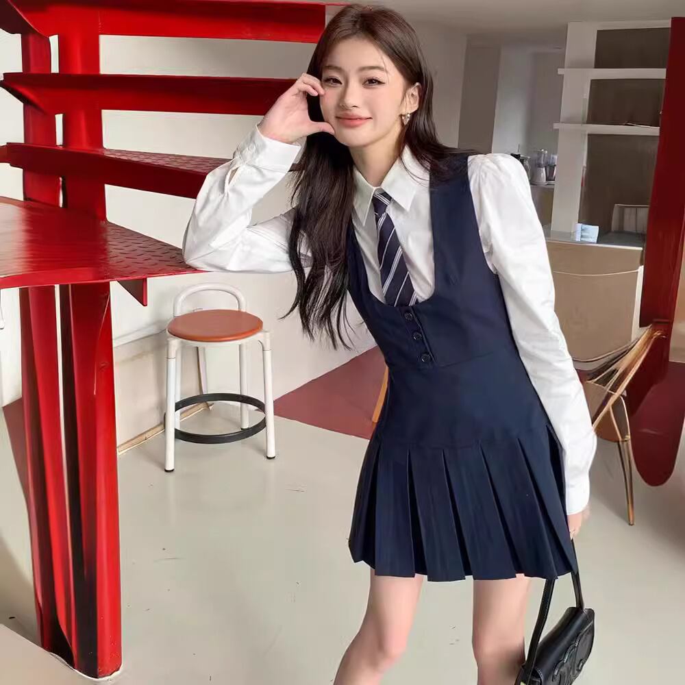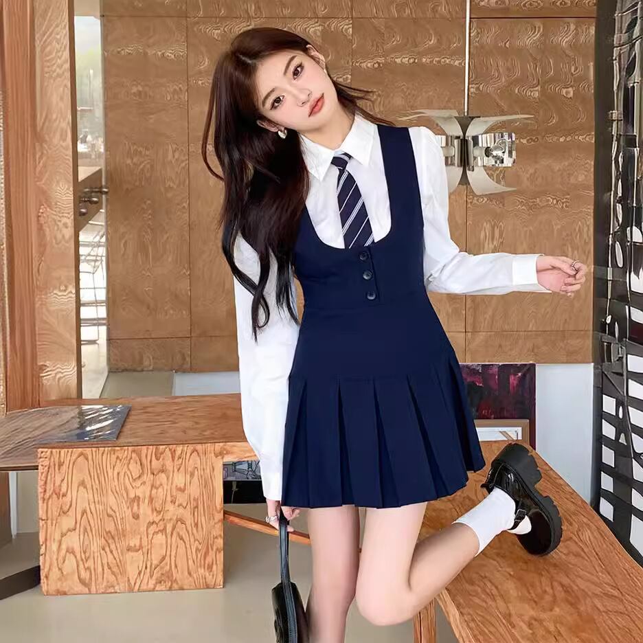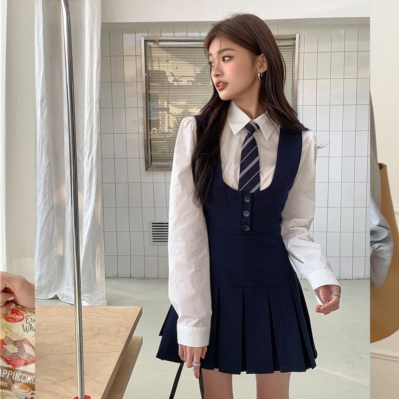 大人気の【大人気】ベストサスペンダードレスカレッジスタイルスーツレディース夏長袖シャツ+ネクタイファッショナブルなツーピーススーツは、夏のファッションシーンにぴったりのトレンディで快適なアイテムです。この魅力的なツーピーススーツは、デイリールックから特別なお出かけまで幅広く活躍できることが期待できます!