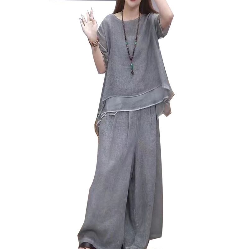 大人気の【大人気】夏の新しいファッション コットンとリネンのスーツ プラスサイズレディースイレギュラーヘムトップスワイドレッグパンツツーピーススーツは、現代の女性に向けて特別にデザインされた、スタイリッシュで快適なアイテムです。このツーピーススーツは、夏のおしゃれなコーディネートからカジュアルな日常使いまで、さまざまなシーンであなたの魅力を引き立てることが期待できます!