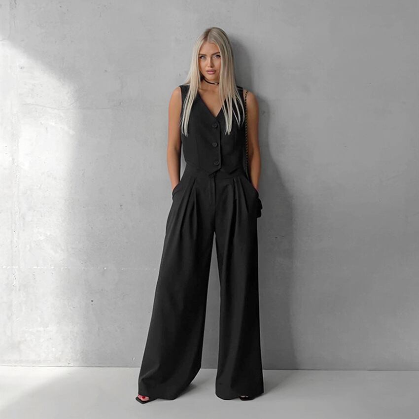 大人気の【大人気】夏のシンプルなファッションカジュアルノースリーブベストVネック 無地ゆったりワイドレッグパンツツーピースセット欧米通勤スーツは、現代の女性に向けて特別にデザインされたスタイリッシュなアイテムです。このツーピースセットは、カジュアルな日常使いからオフィススタイルまで、さまざまなシーンであなたの魅力を引き立てることが期待できます!