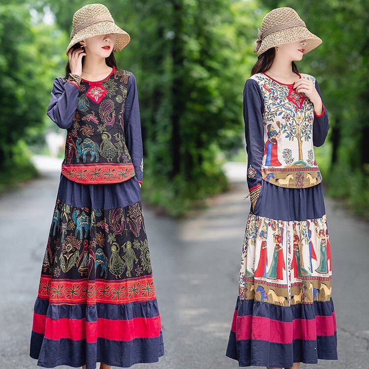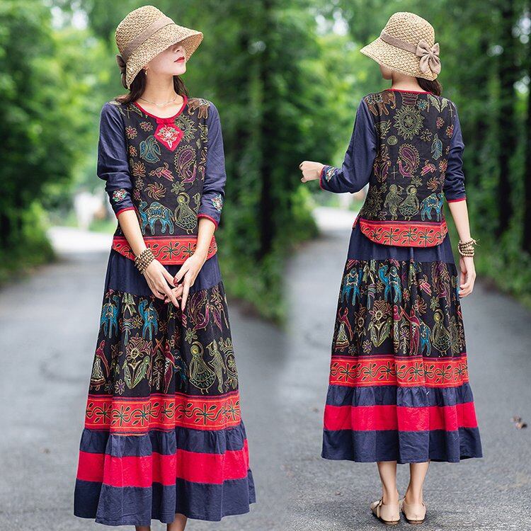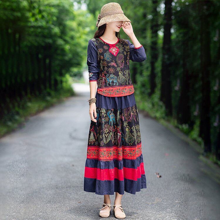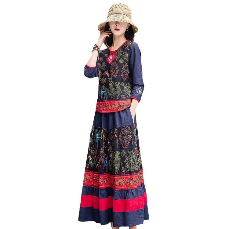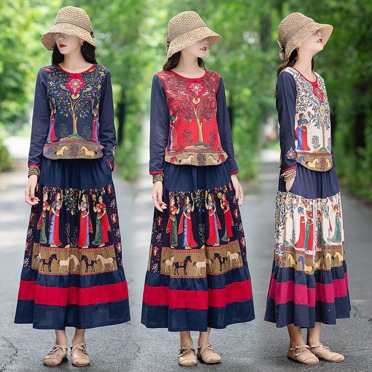 大人気の【大人気】秋の新しいファッション オールマッチラウンドネックコットンリネンエスニックスタイルスーツリズミカルな田園風ミドル丈スカートは、秋にぴったりの注目アイテムです。このスーツは、特に現代の女性に向けてデザインされており、カジュアルな日常使いからおしゃれなお出かけまで、さまざまなシーンであなたの魅力を引き立てることが期待できます!