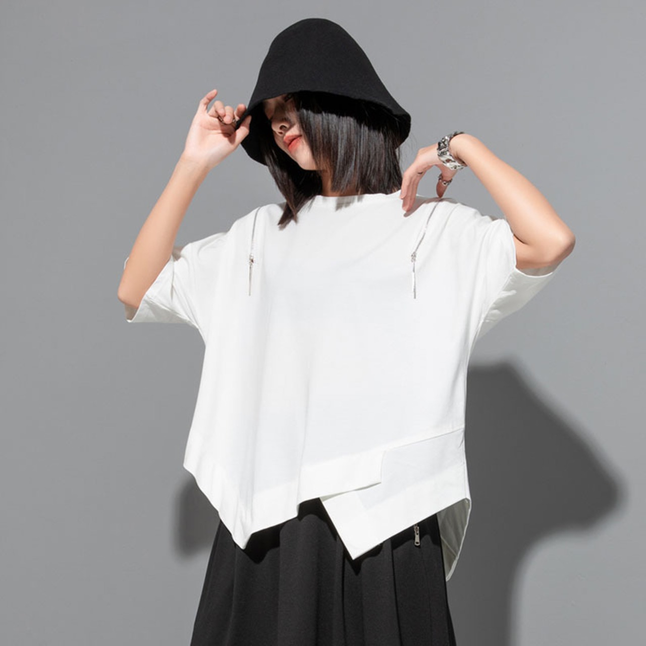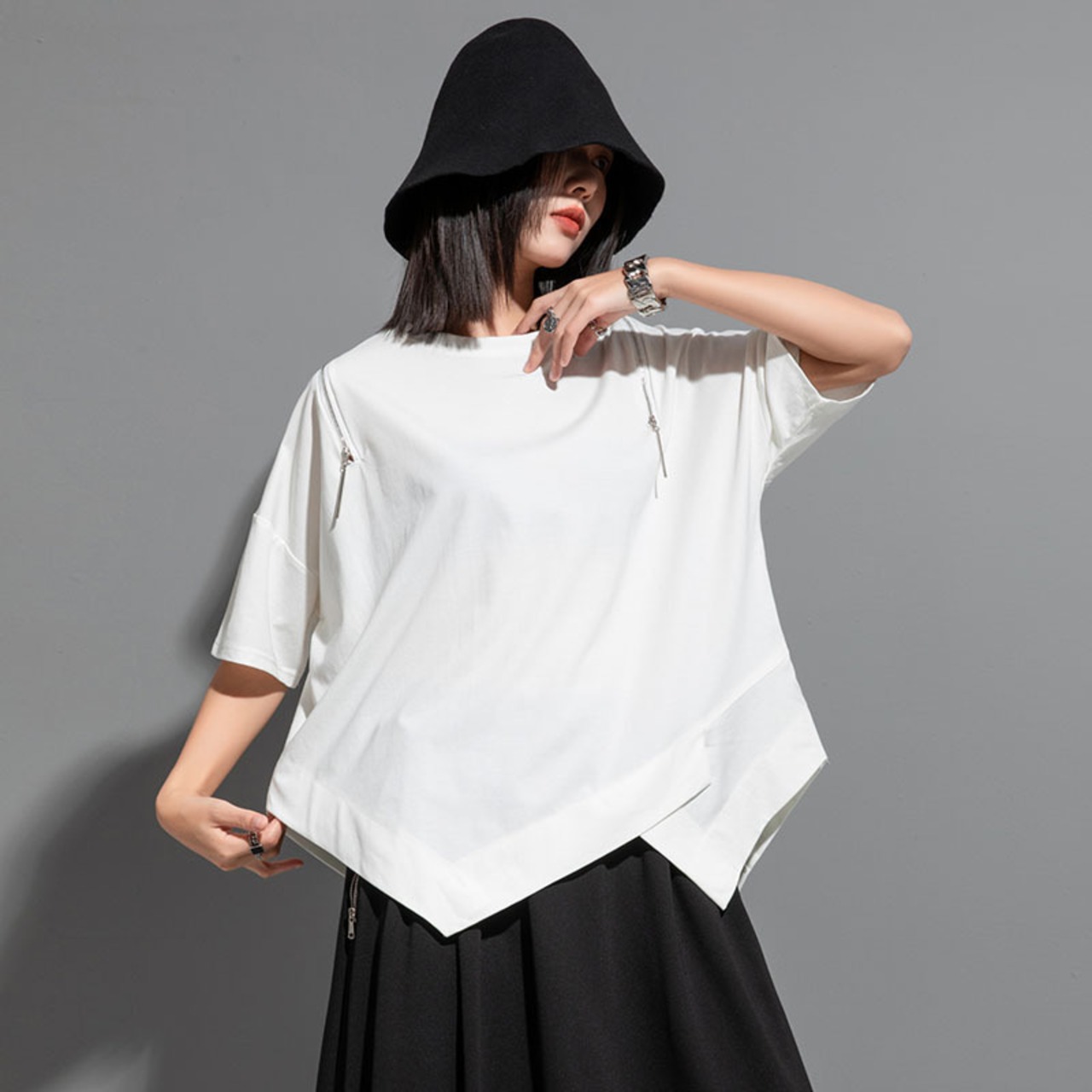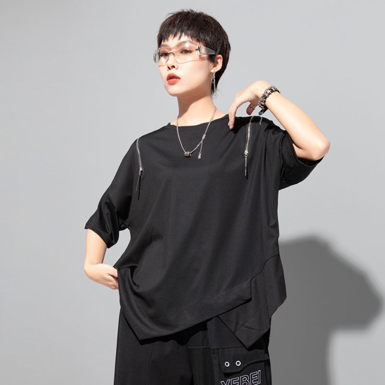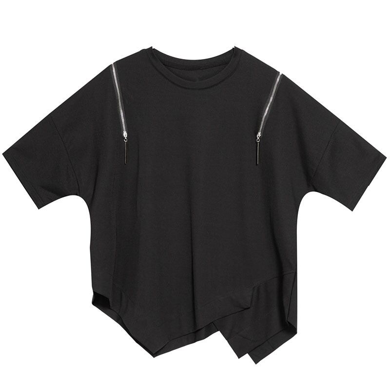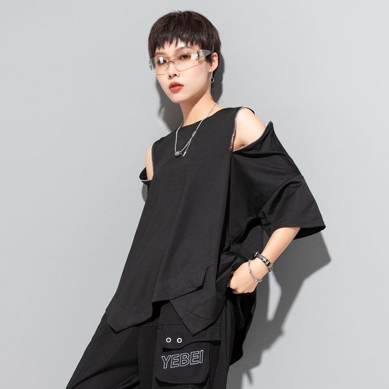 大人気の【大人気】欧米のカジュアルなオフショルダー半袖Tシャツの個性的な不規則な縫い合わせのトップスのジッパーのゆったりとしたニッチなファッションの婦人服のトレンドは、春夏シーズンにぴったりの注目アイテムです。このトップスは、特に現代の女性に向けてデザインされており、カジュアルなお出かけからリラックスした日常使いまで、さまざまなシーンであなたの魅力を引き立てることが期待できます!