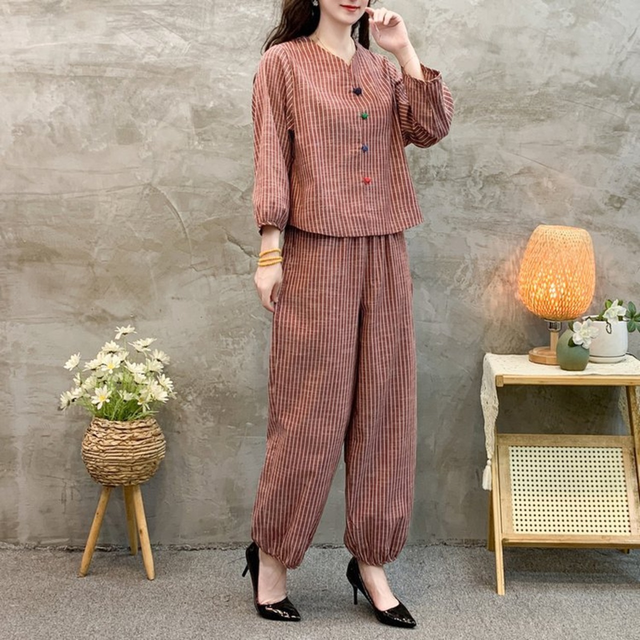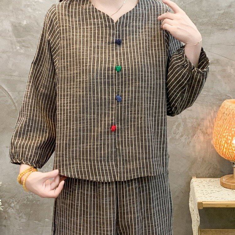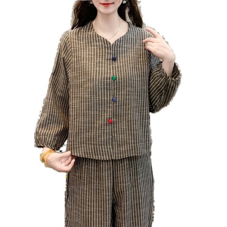 大人気の【大人気】綿麻ストライプ春秋ママスーツ おしゃれゆったりスリミングカジュアル肉カバー長袖ハーレムパンツツーピーススーツは、春と秋にぴったりの注目アイテムです。このツーピーススーツは、特にスタイルと快適さを求める女性のためにデザインされており、日常のお出かけから特別なシーンまで、幅広いシーンであなたの魅力を引き立てます!